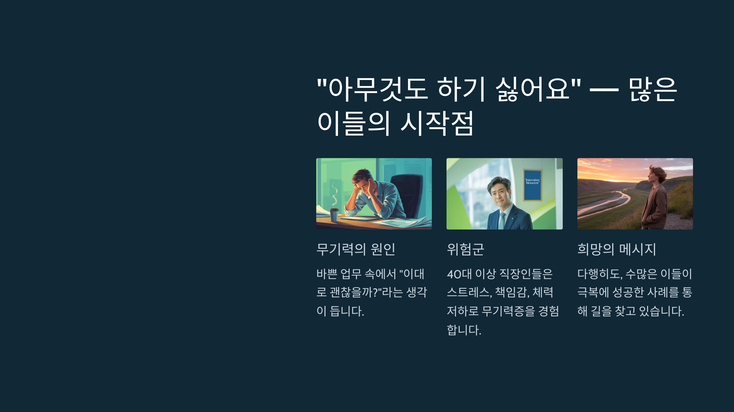 바쁜 업무 속에서 문득 "이대로 괜찮을까?"라는 생각이 드는 순간이 있습니다. 특히 40대 이상 직장인들은 지속된 스트레스, 책임감, 체력 저하로 인해 무기력증을 경험할 가능성이 높습니다. 하지만 다행히도, 수많은 이들이 극복에 성공한 사례를 통해 길을 찾고 있습니다.