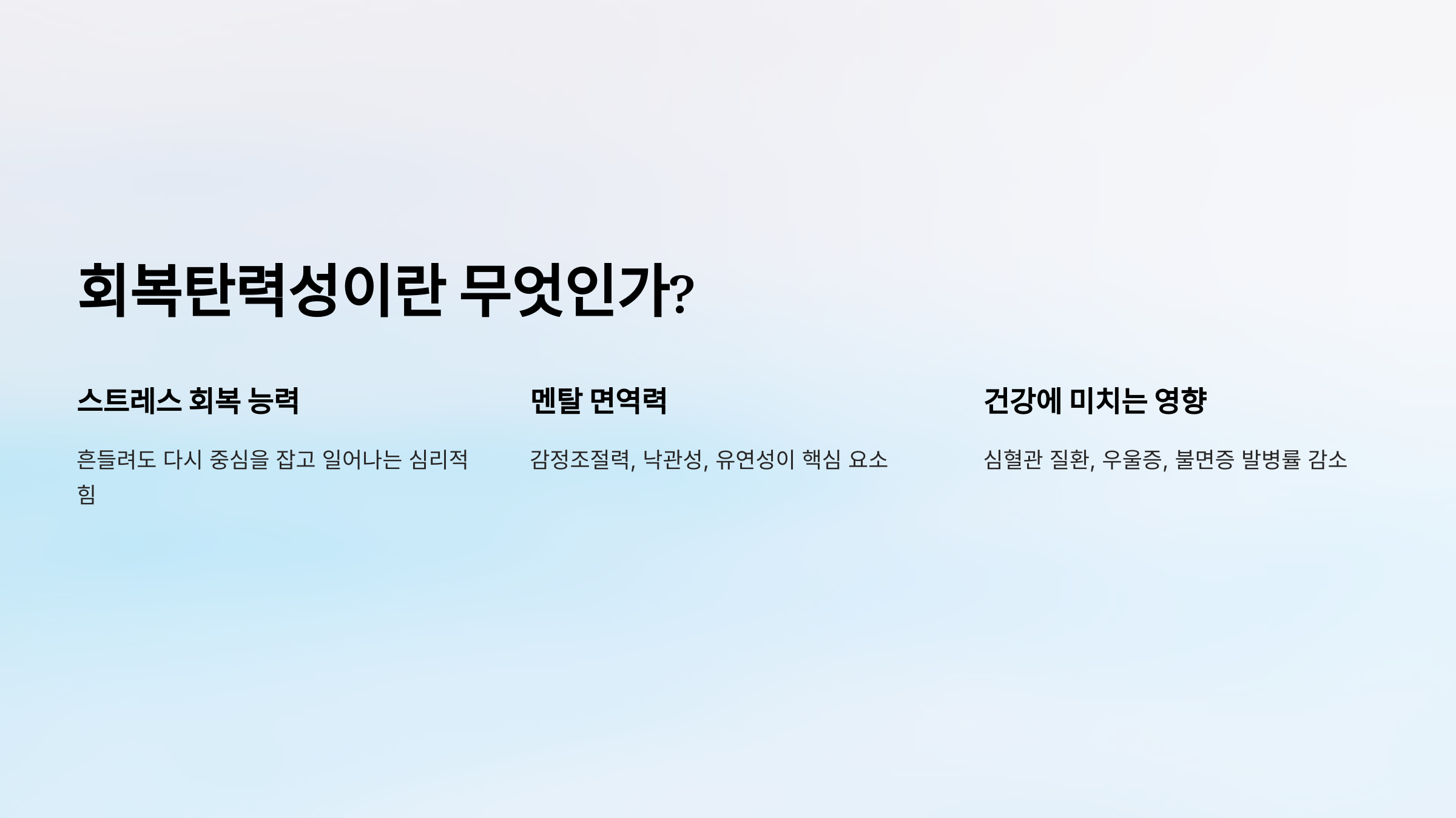 무너진 멘털은 누구에게나 찾아옵니다. 중요한 것은 ‘다시 일어나는 힘’을 기르는 것. 회복탄력성은 나이와 관계없이 키울 수 있으며, 특히 40대 이후에는 더욱 절실한 심리 생존 능력입니다. 지금 이 순간, 내 마음을 회복시키는 첫 발걸음을 시작해 보세요.