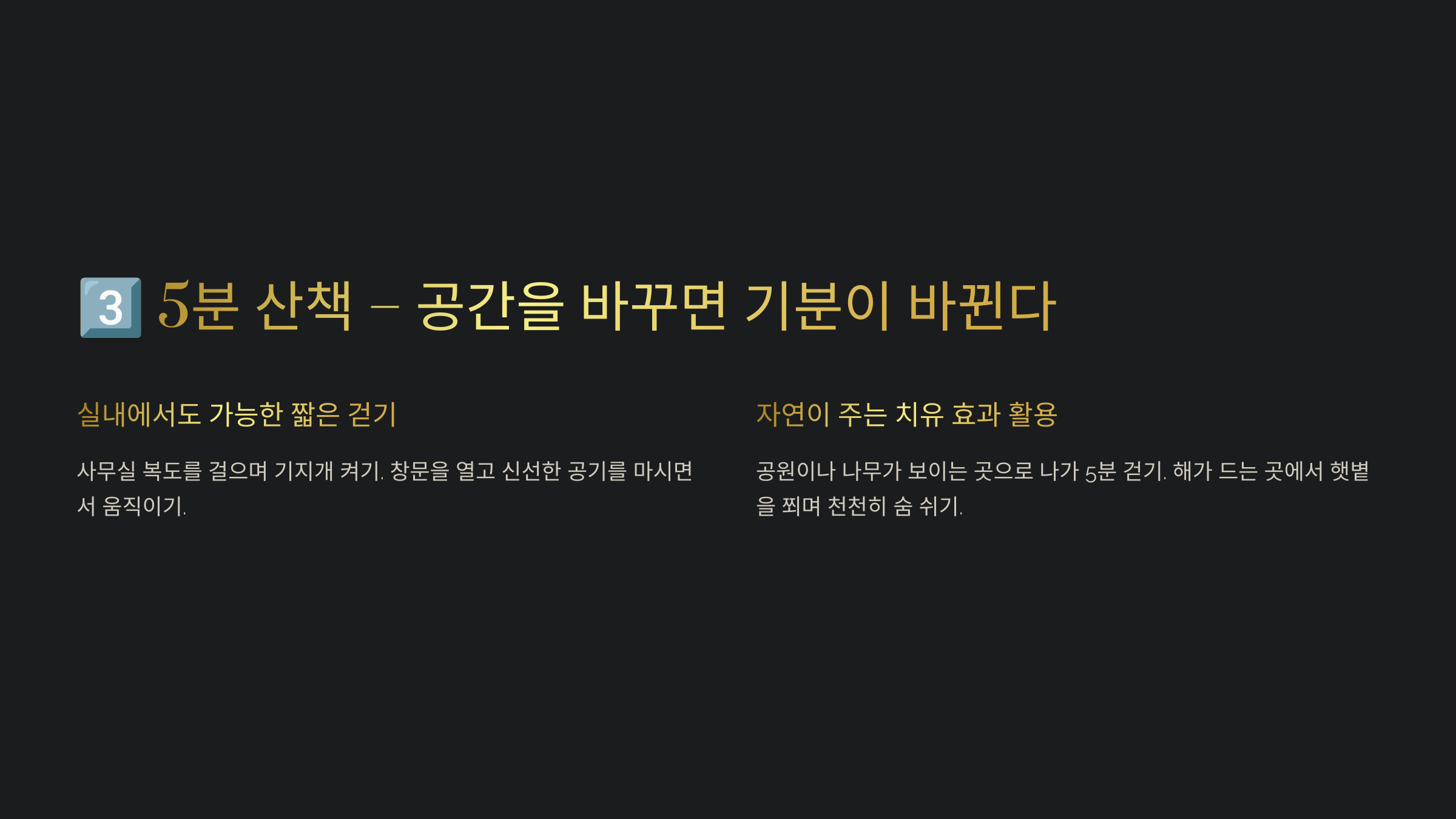 3️⃣ 5분 산책 – 공간을 바꾸면 기분이 바뀐다
