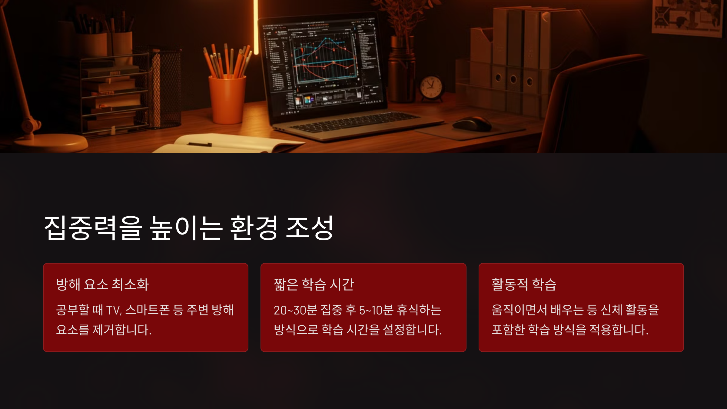 - 공부할 때 주변 방해 요소 최소화 (TV, 스마트폰 제거)