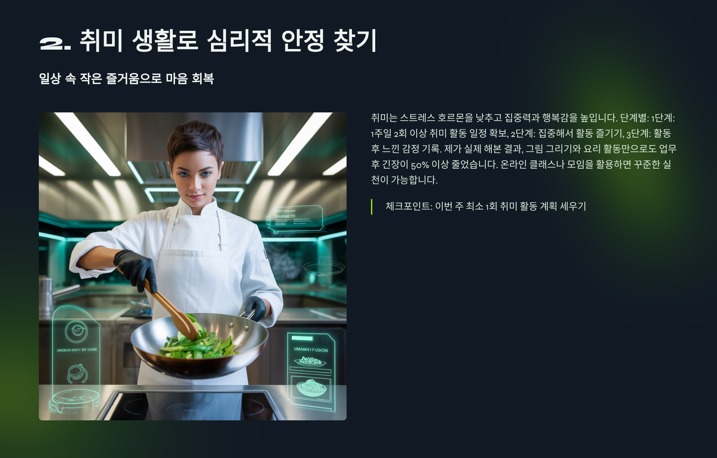 - 관계 개선, 취미 활동, 수면 관리로 장기적 스트레스 완화 가능