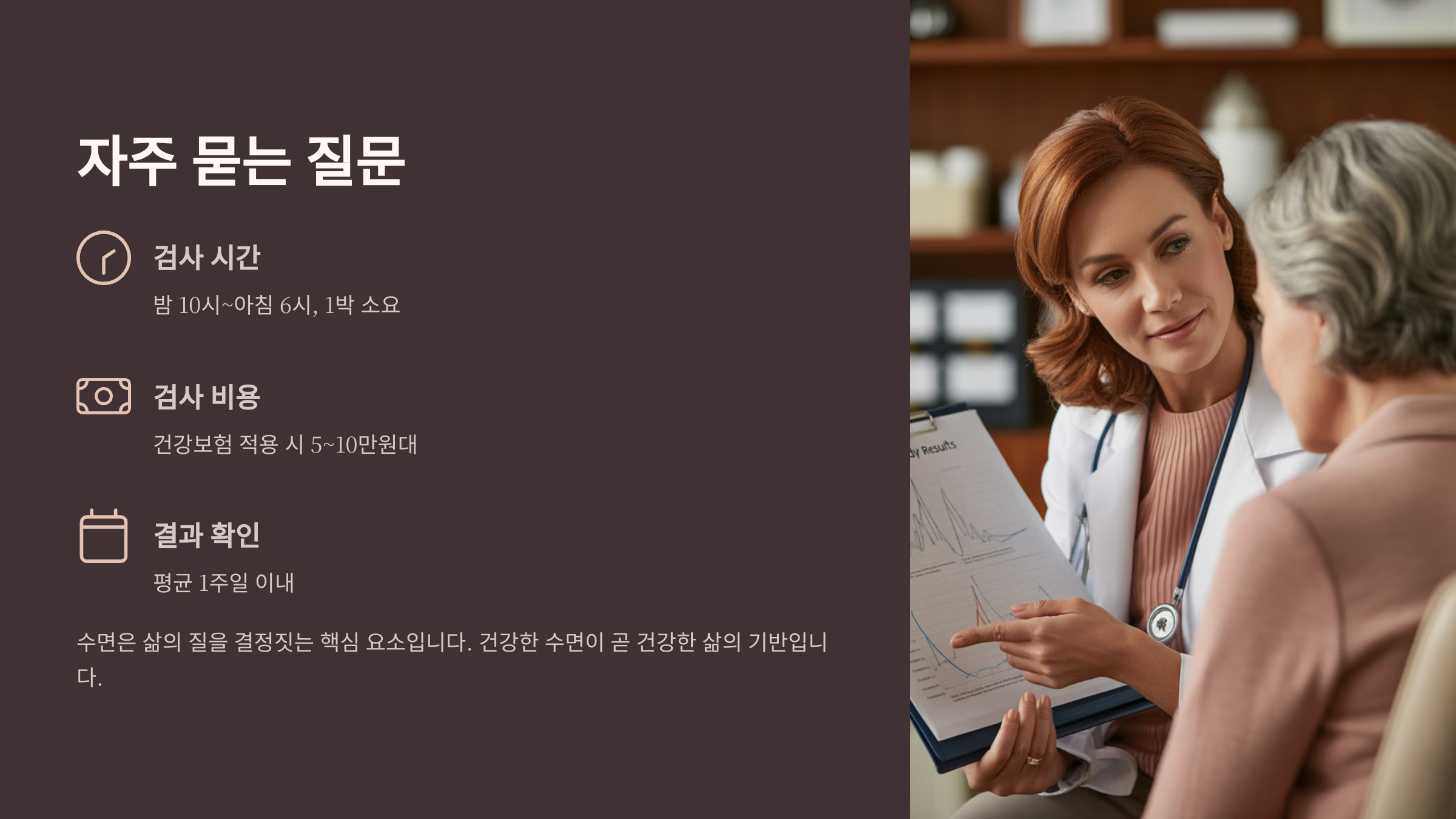• “검사비가 부담돼요.” → 건강보험 적용 가능 여부 확인 필수. 일부 수면다원검사는 건강보험 지원을 받을 수 있습니다.