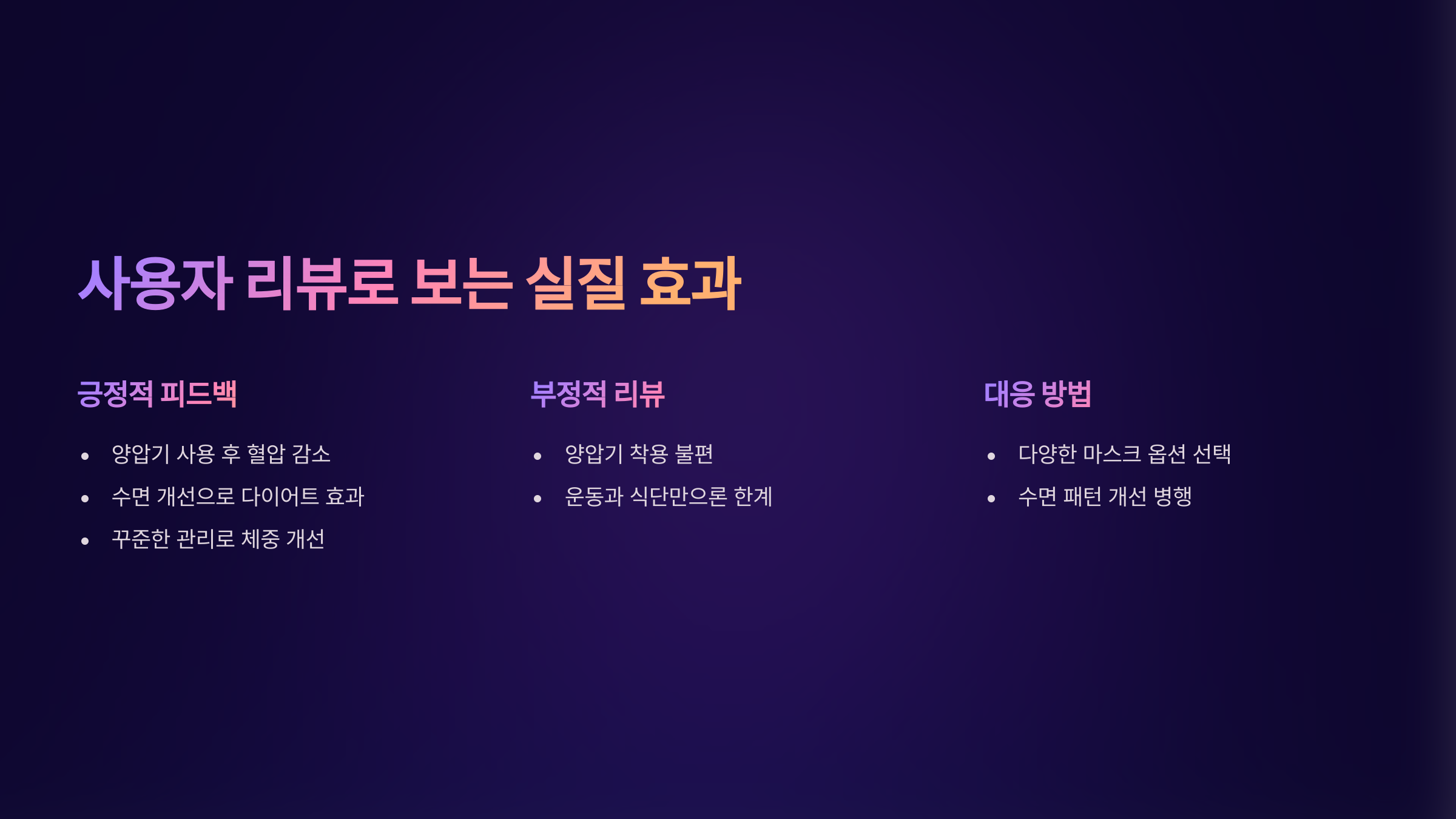 - “양압기 사용 후 아침 혈압이 확실히 낮아졌어요.”