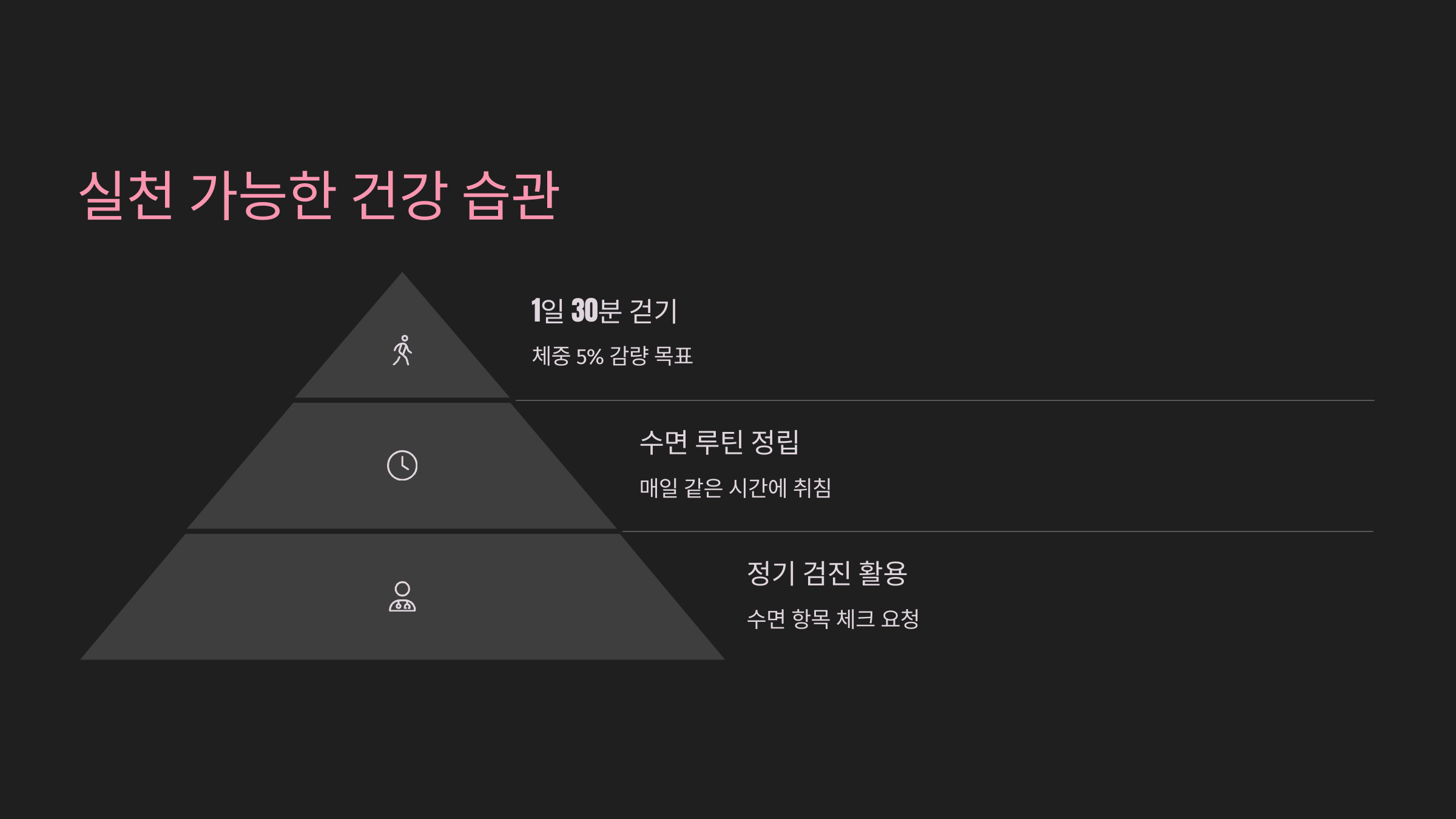 비만은 수면 무호흡의 가장 큰 위험요소입니다. 전문가들은 "체중의 5%만 감량해도 증상이 현저히 줄어든다"라고 말합니다. 현실적으로 매일 30분 빠르게 걷는 습관부터 시작해 보세요. 운동은 수면의 질도 함께 끌어올립니다.
