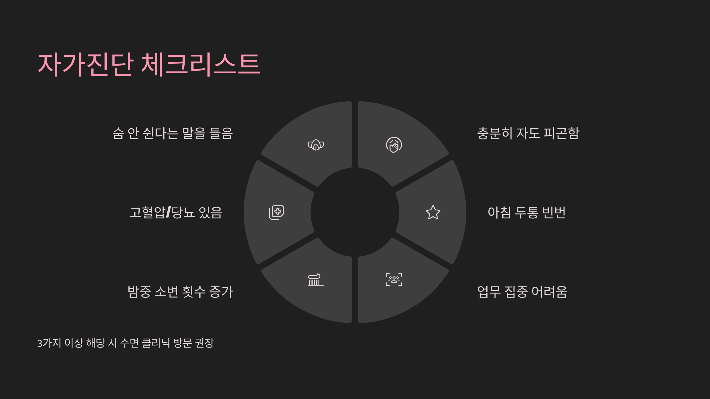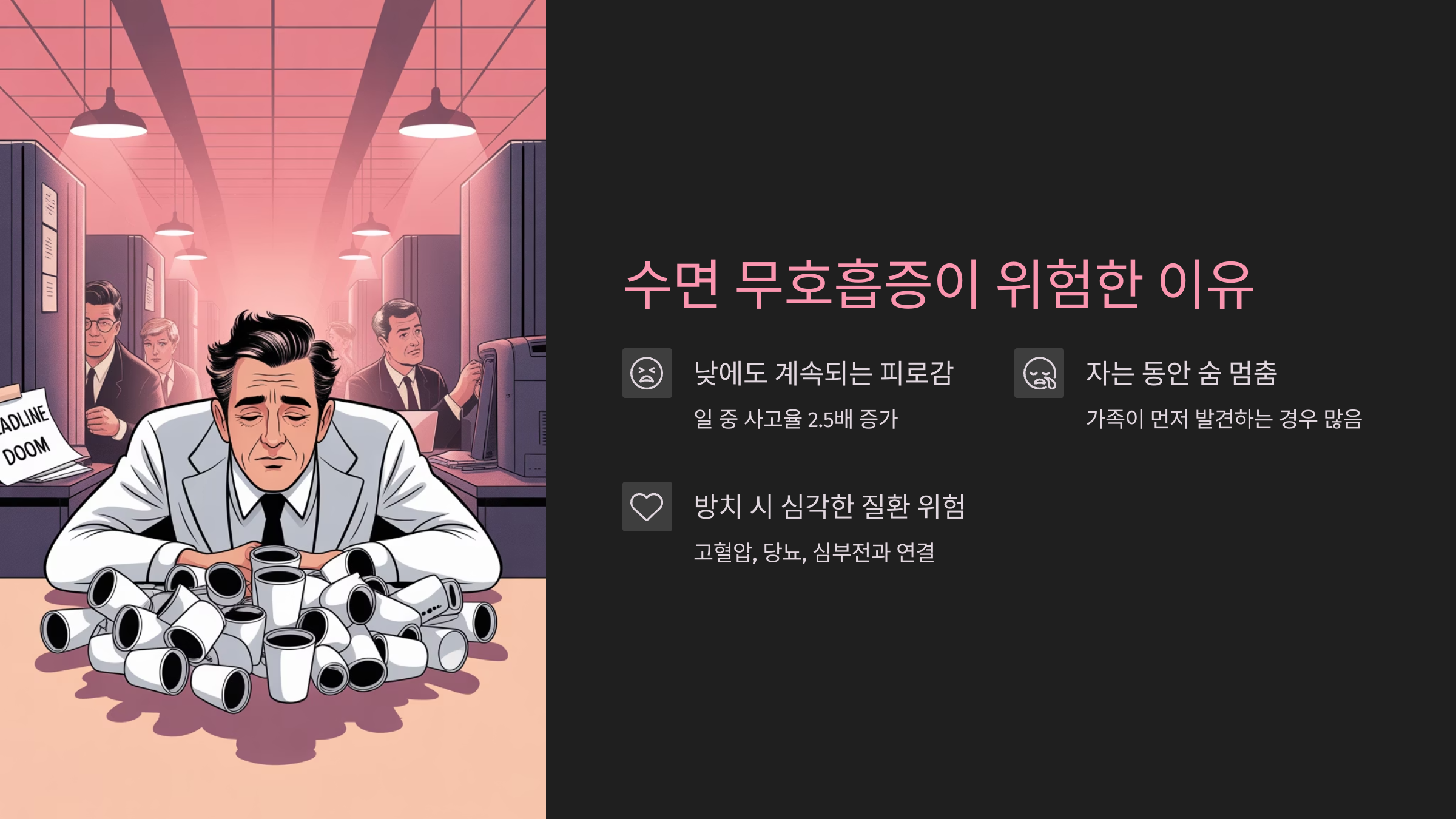 코골이야 흔한 일이지만, 숨이 멈추는 건 단순한 문제가 아닙니다. 방치된 수면 무호흡증은 고혈압, 당뇨, 심부전 등 만성질환과 직접 연결됩니다. 특히 중장년층에서 사망률 증가와도 관련이 있어 조기 발견이 무엇보다 중요합니다. 건강검진 시 수면 관련 상담을 꼭 요청해 보세요.