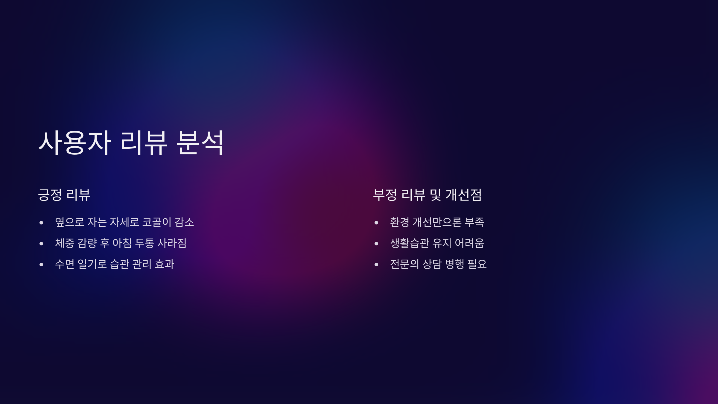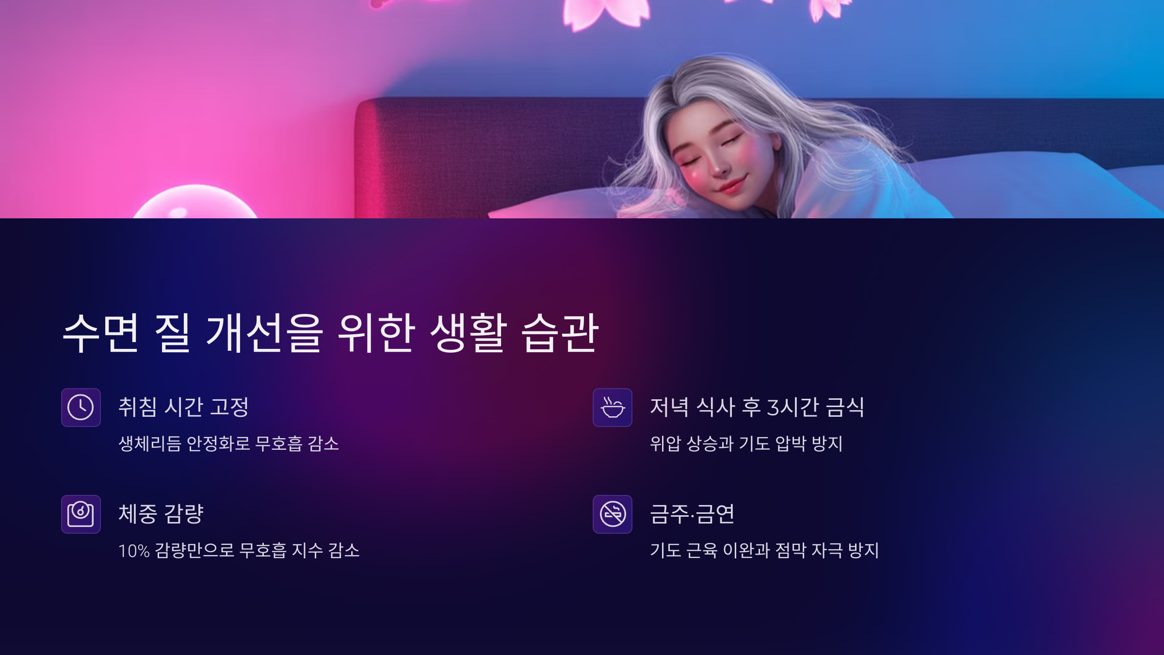 • “생활습관 유지가 어려웠어요.” → 수면 파트너의 도움, 알람 앱, 체중 감량 프로그램 병행 추천