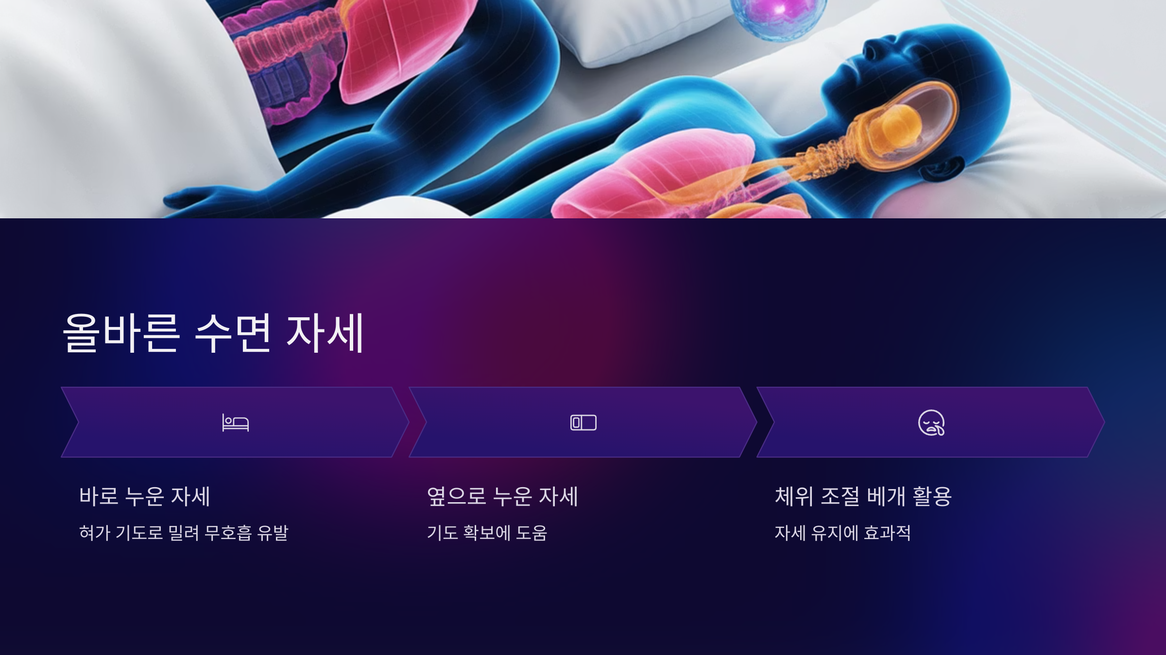 바로 눕는 자세는 혀가 기도로 밀리며 무호흡을 유발합니다. 왼쪽 옆으로 눕는 자세는 기도 확보에 도움이 되며, 간단한 체위 조절 베개만으로도 효과를 볼 수 있습니다.