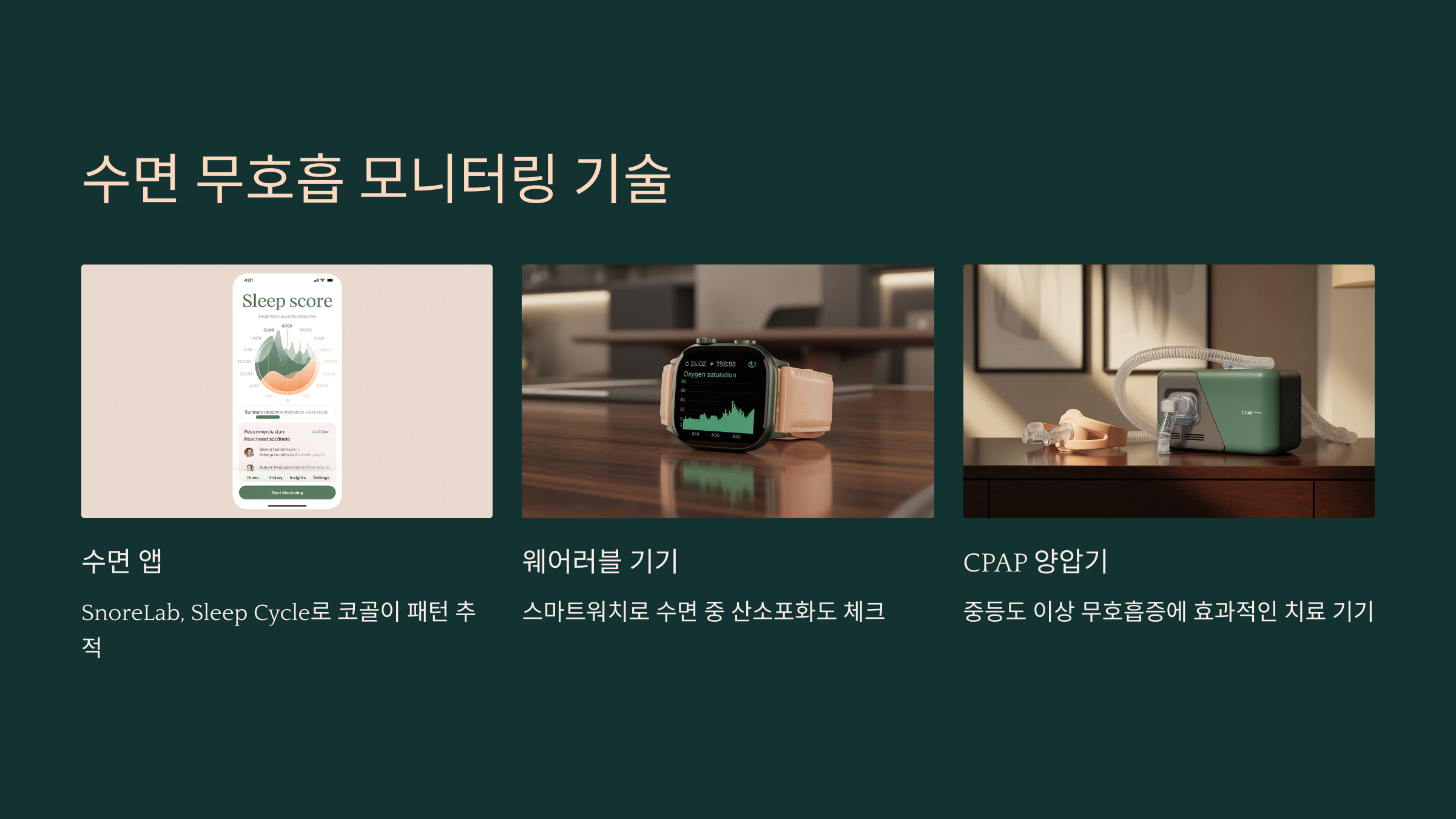 SnoreLab, Sleep Cycle 같은 앱으로 코골이와 무호흡 패턴을 추적하고, CPAP(양압기) 기기 상담 전 활용해 보는 것도 좋습니다. 간단한 웨어러블 기기(스마트워치)로도 수면 중 산소포화도 체크가 가능합니다.