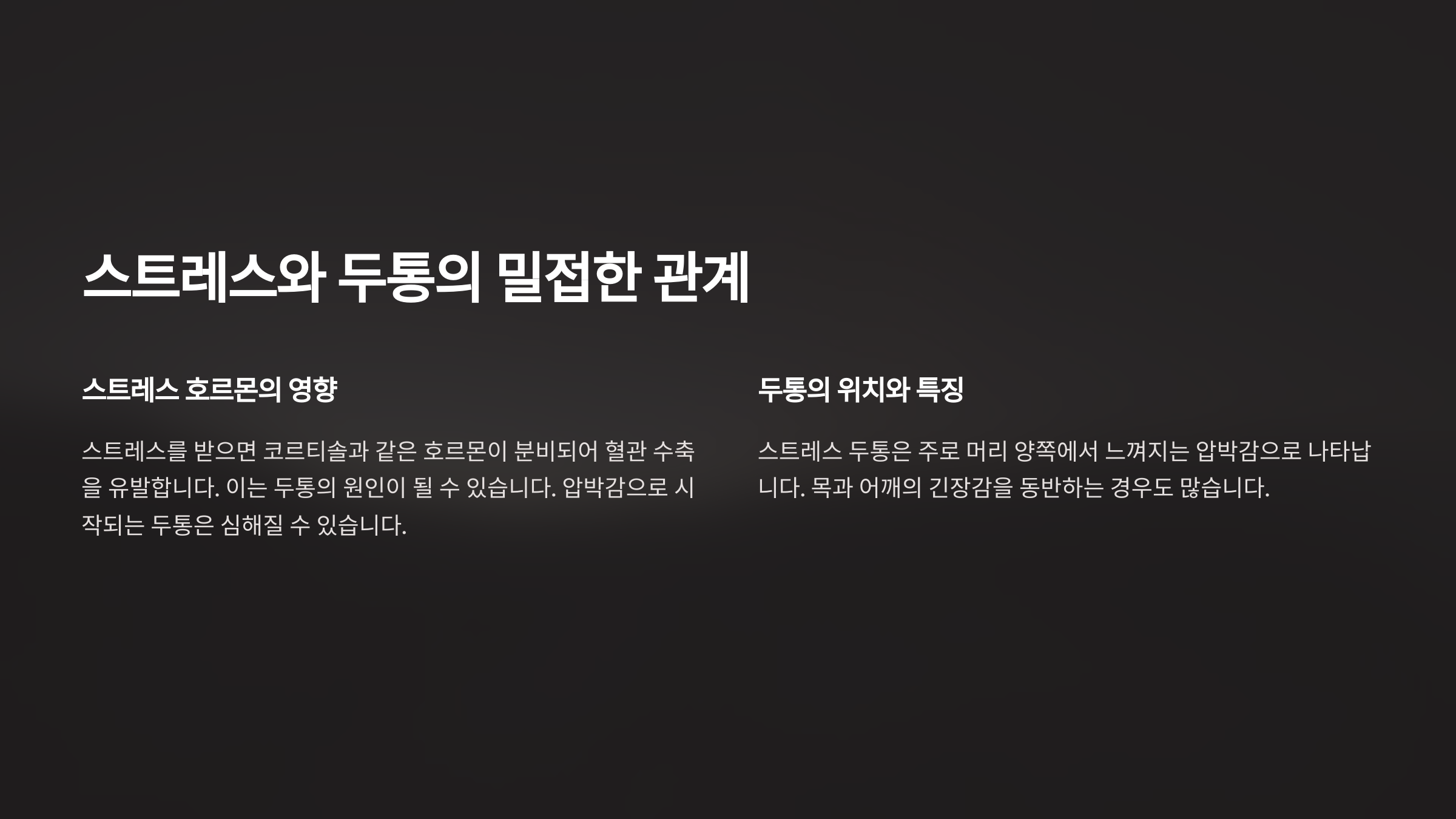 스트레스를 받으면 우리 몸은 다양한 반응을 보입니다. 특히, 스트레스 호르몬인 코르티솔이 분비되고, 이는 혈관을 수축시킵니다. 이런 과정은 두통을 유발하는 주요 원인 중 하나입니다. 마치 고무줄을 과도하게 잡아당기면 찢어지는 것처럼, 우리의 두통도 스트레스에 의해 점점 심해질 수 있습니다.