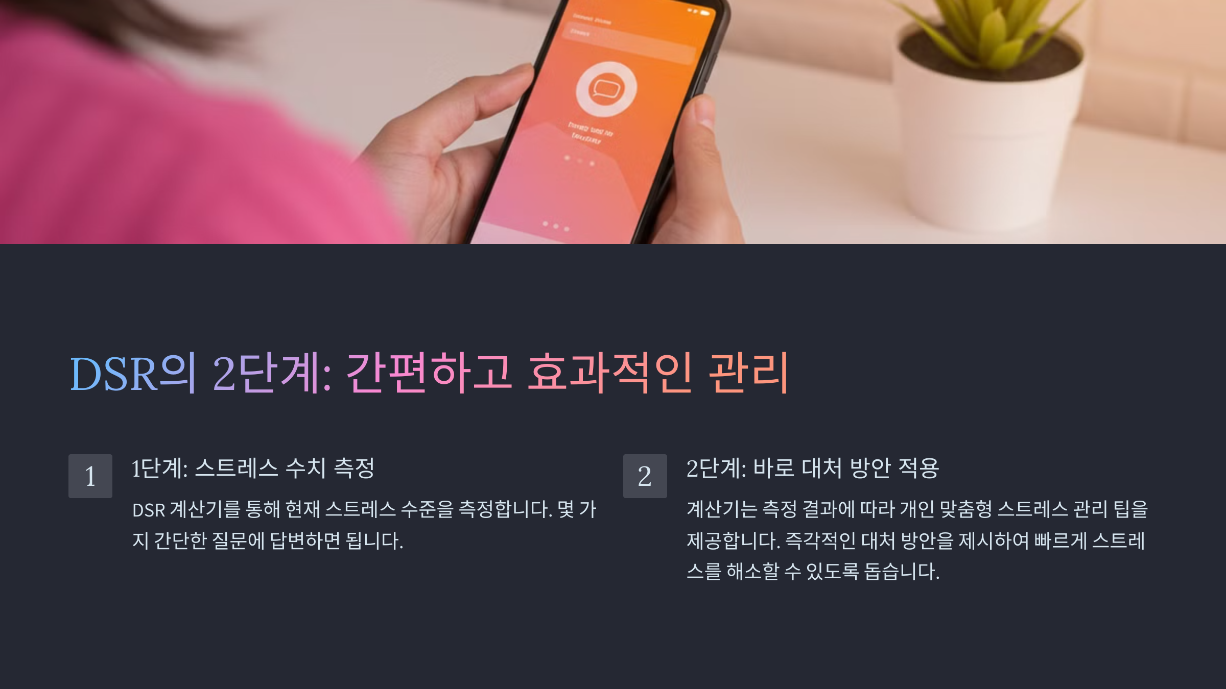 스트레스는 현대 사회에서 피할 수 없는 존재입니다. 하지만 스트레스를 효과적으로 관리하는 방법은 존재합니다. DSR의 3단계와 2단계를 이해하고, 계산기를 활용하여 스트레스를 수치적으로 분석하는 방법은 여러분의 스트레스 관리에 큰 도움이 될 것입니다. 일상 속 작은 변화와 개인 맞춤형 대처 방법을 통해 스트레스를 보다 효과적으로 관리하고, 더 나은 삶을 만들어가길 바랍니다. 여러분의 스트레스를 대하는 태도가 긍정적으로 변화하기를 기원합니다. 스트레스를 관리하는 지혜를 가지고, 보다 행복한 삶을 누리시길 바랍니다.