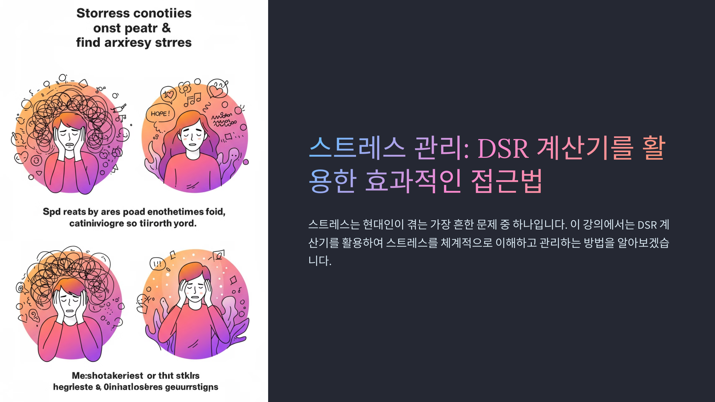 DSR의 3단계는 다음과 같습니다. 첫 번째 단계는 스트레스의 원인을 파악하는 것입니다. 즉, 내가 왜 스트레스를 받는지를 명확히 아는 것이죠. 두 번째 단계는 이를 평가하여 스트레스의 정도를 파악하는 것이며, 마지막 단계는 적절한 대처 방법을 찾는 것입니다. 이 과정을 통해 우리는 스트레스를 보다 체계적으로 관리할 수 있습니다.
