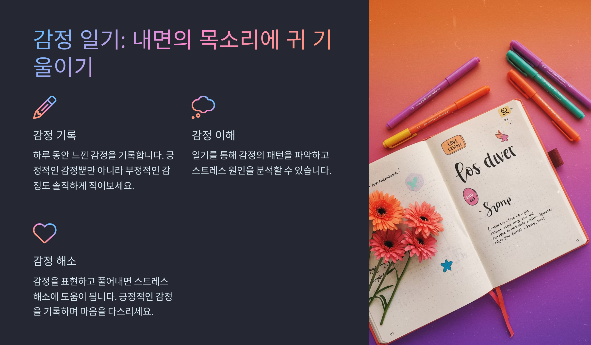감정 일기를 쓰는 것도 좋은 방법입니다. 하루 동안 느낀 감정을 솔직하게 적어보세요. 어떤 상황에서 스트레스를 느꼈는지, 그때의 감정은 어땠는지 기록하는 것이죠. 이렇게 하면 자신의 감정을 보다 명확하게 이해할 수 있습니다. 감정 일기는 스트레스를 해소하는 데 큰 도움이 됩니다.