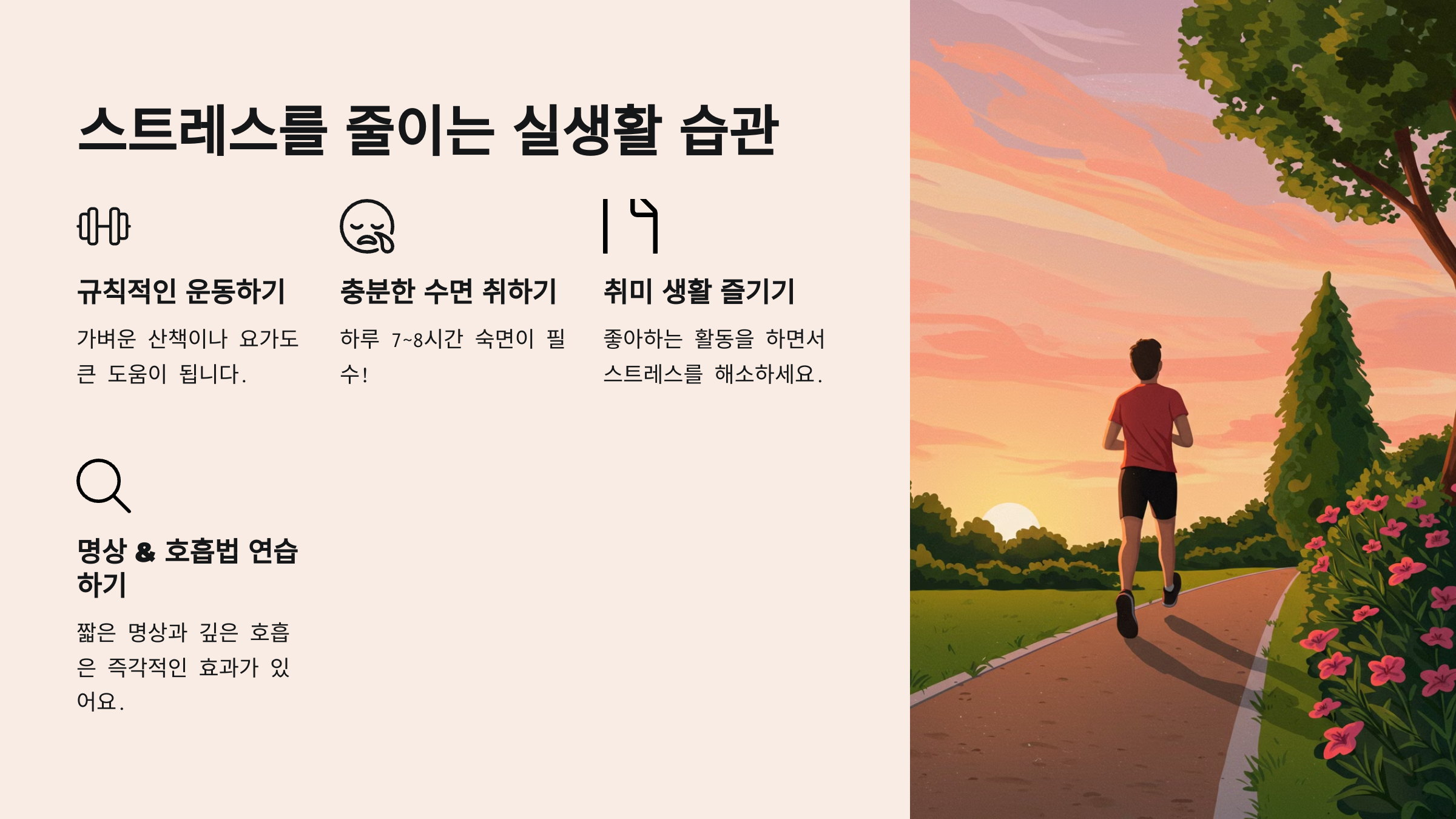 ✅ 명상 & 호흡법 연습하기: 짧은 명상과 깊은 호흡은 즉각적인 효과가 있어요.