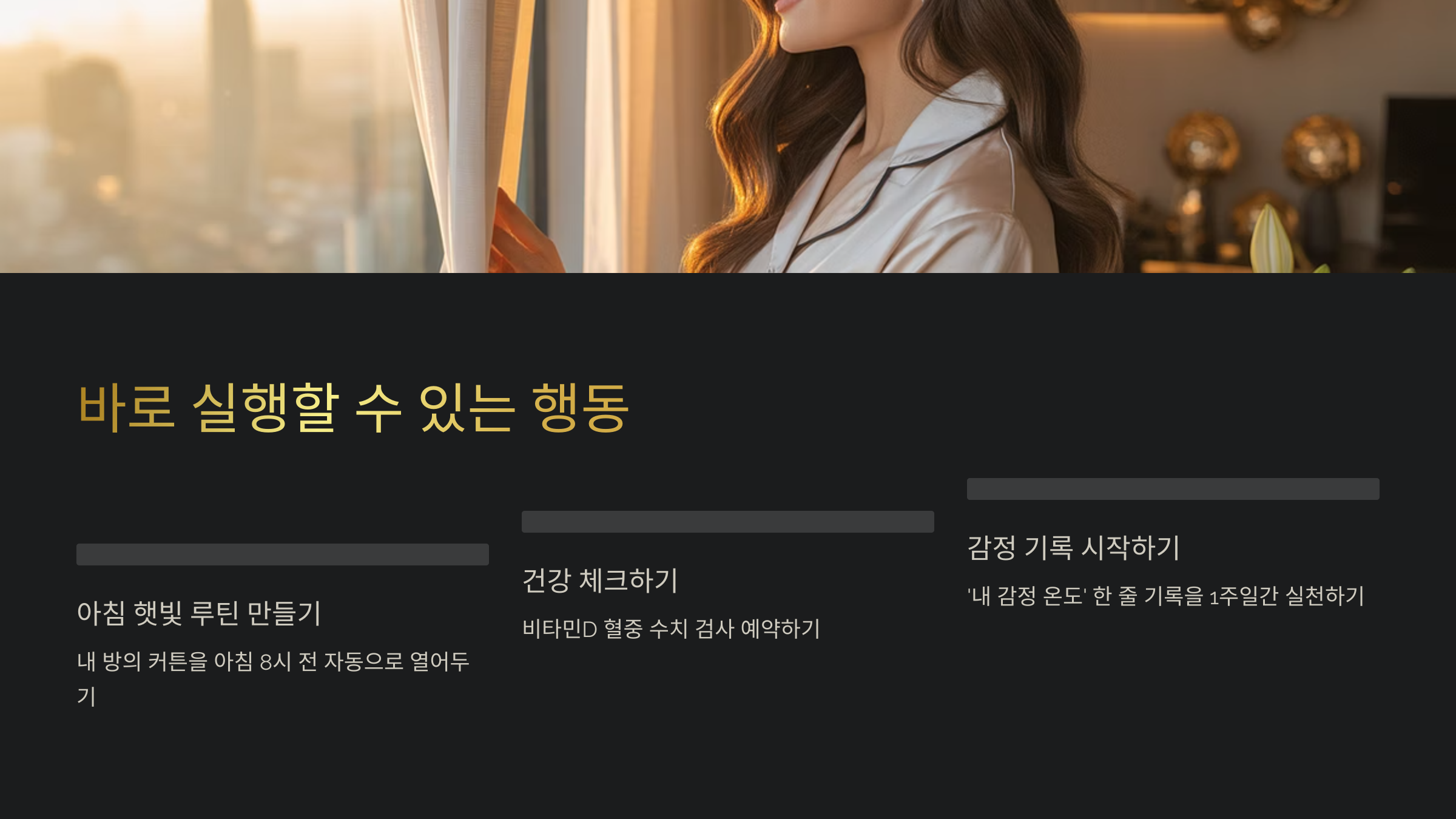 일어나자마자 커튼을 열고 **자연광에 노출**되면 생체리듬 회복에 큰 도움이 됩니다. 주말에는 꼭 오전 산책을 추천드립니다. > 비 오는 날은 창가에 앉는 것도 충분히 효과적입니다.