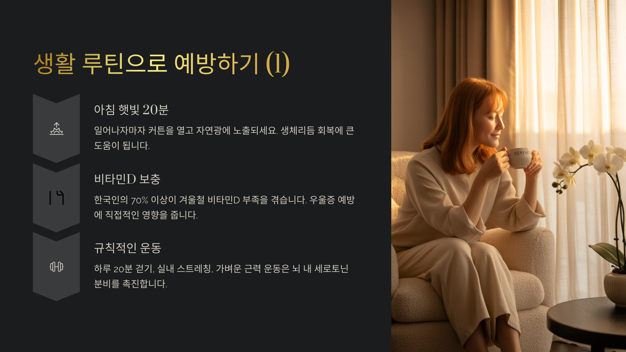 - 일광욕, 비타민D 보충, 감정 기록 루틴으로 계절성 우울을 충분히 조절할 수 있습니다