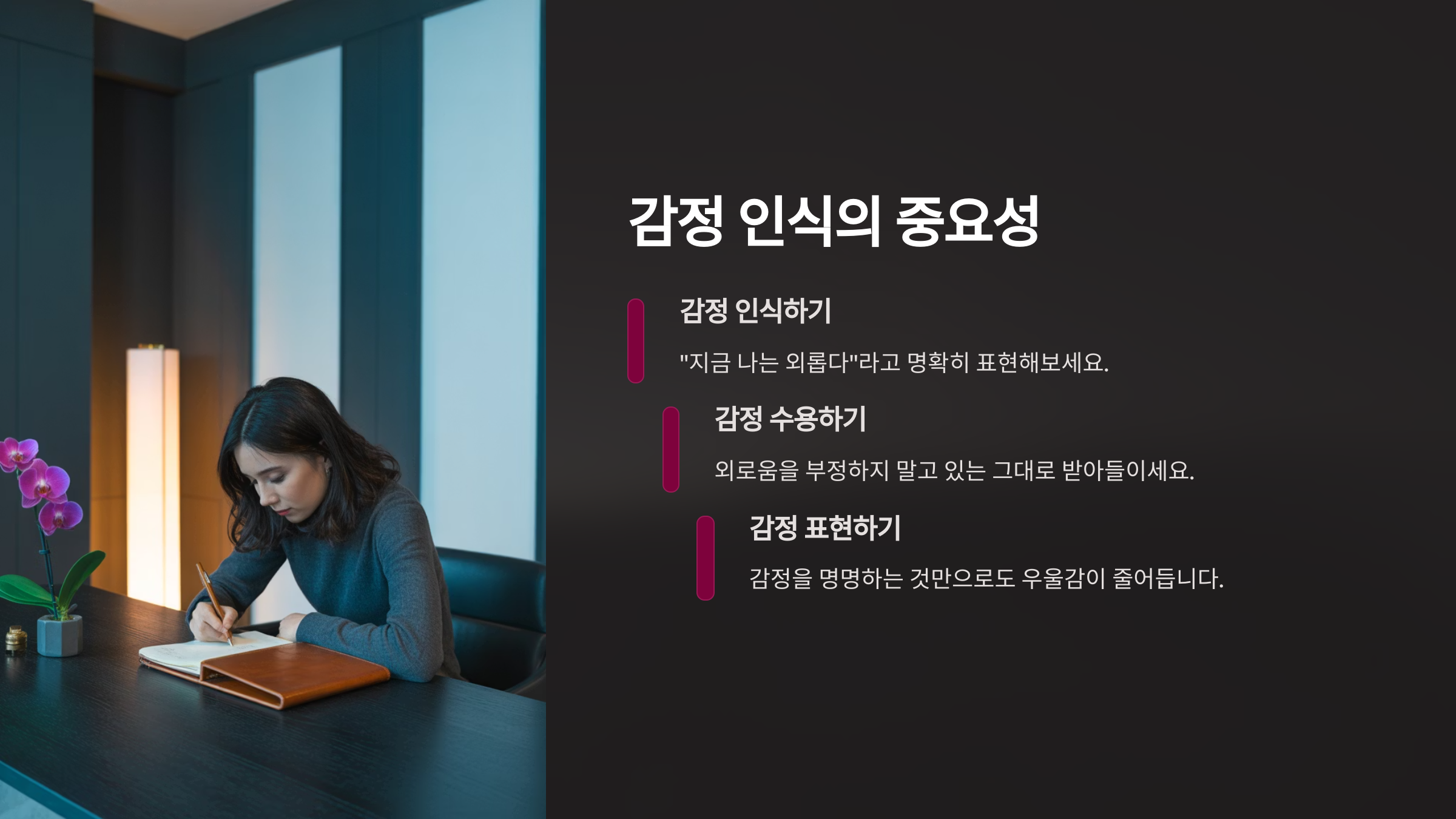 “지금 나는 외롭다”외로움을 부정하지 말고 **감정 언어로 명확히 표현**해보세요. 감정을 명명하는 것만으로도 **우울감이 줄어든다**는 연구 결과가 있습니다.
