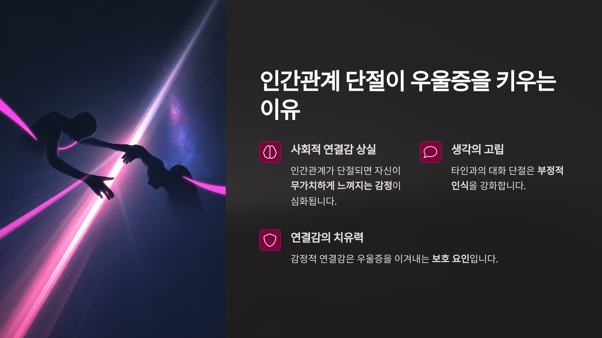한 줄 요약: 외로움과 단절감이 우울증을 심화시키는 심리적 원인과 이를 극복하기 위한 관계 회복 전략 제시