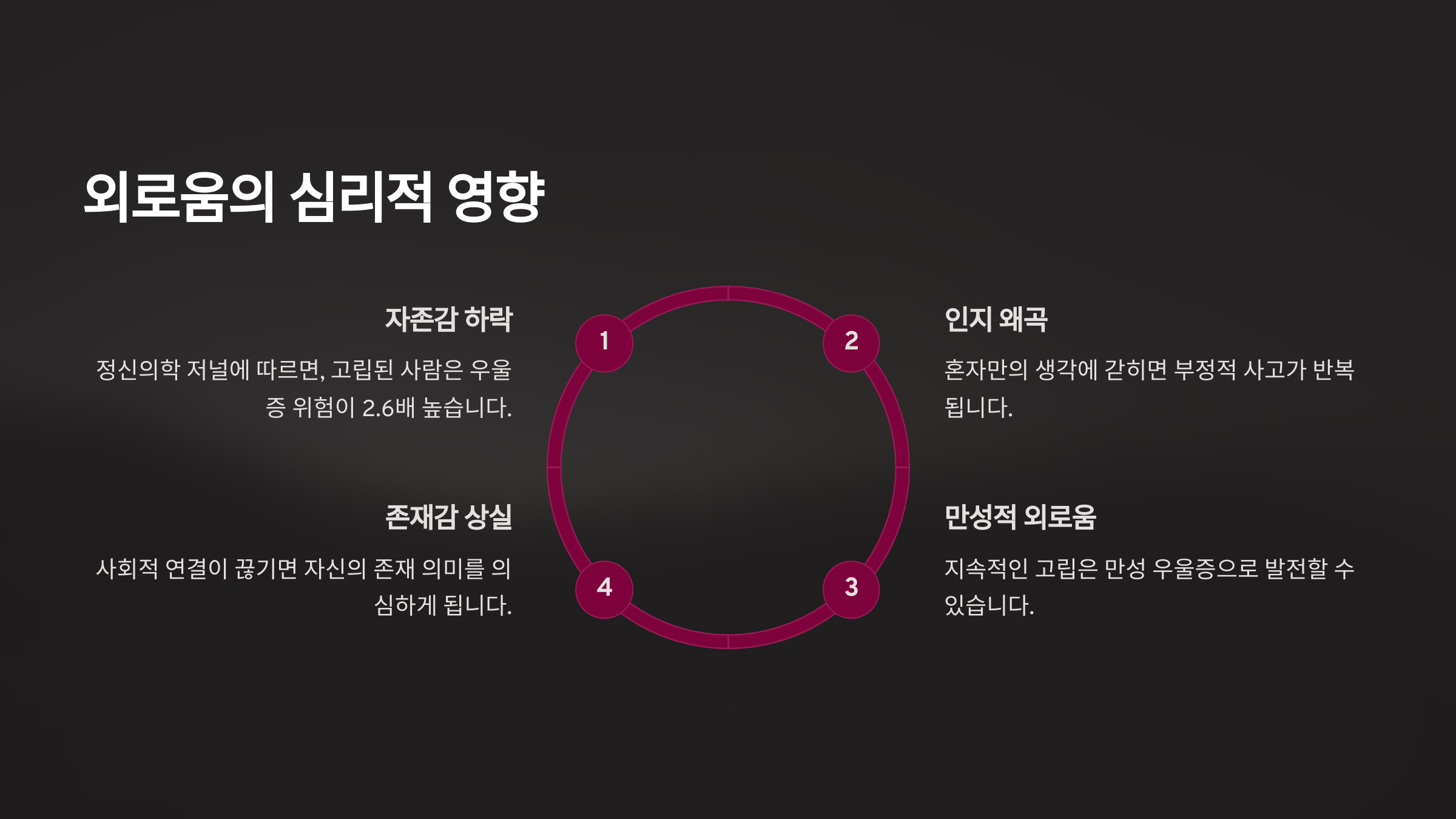 핵심 키워드: 사회적 고립, 외로움, 우울증 원인, 관계 단절, 심리적 영향