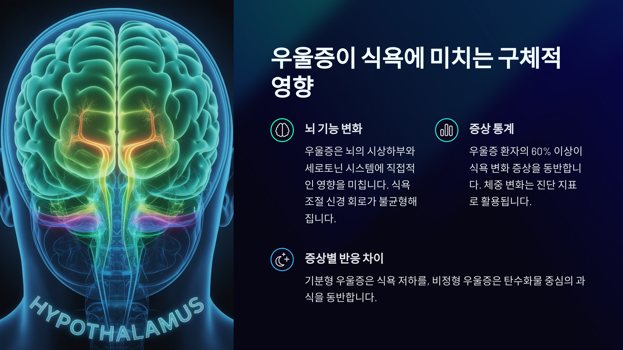 우울증은 단순한 기분 저하를 넘어, **뇌의 시상하부와 세로토닌 시스템에 직접적인 영향을 미칩니다.** 이로 인해 식욕을 조절하는 신경 회로가 불균형해지며, **어떤 사람은 폭식하고, 어떤 사람은 식사를 거르게 되는** 극단적인 현상이 나타납니다.
