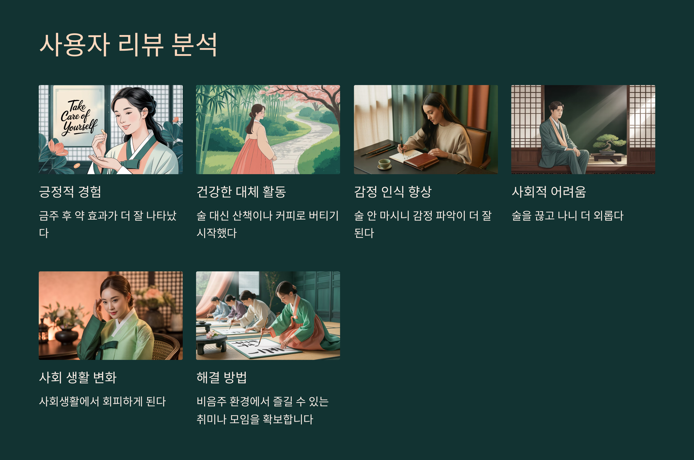 ➡️ 해결 방법: 비음주 환경에서 즐길 수 있는 취미나 모임을 확보하고, 심리상담이나 동료 지원 프로그램 활용이 도움이 됩니다.