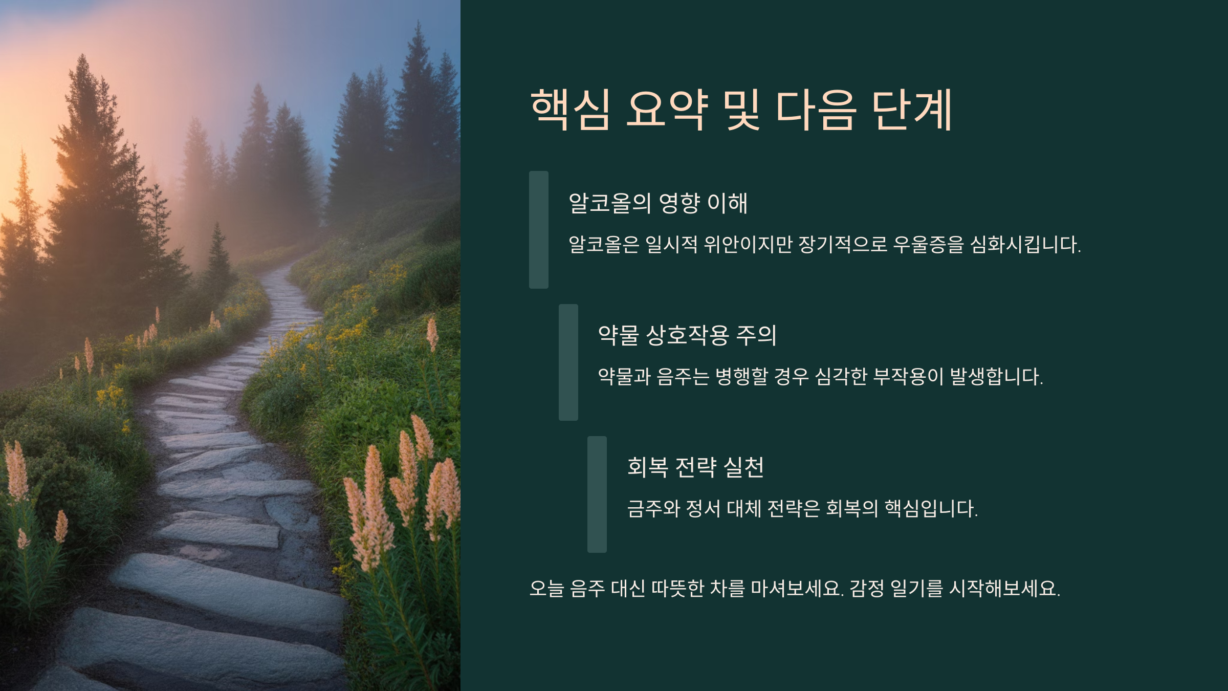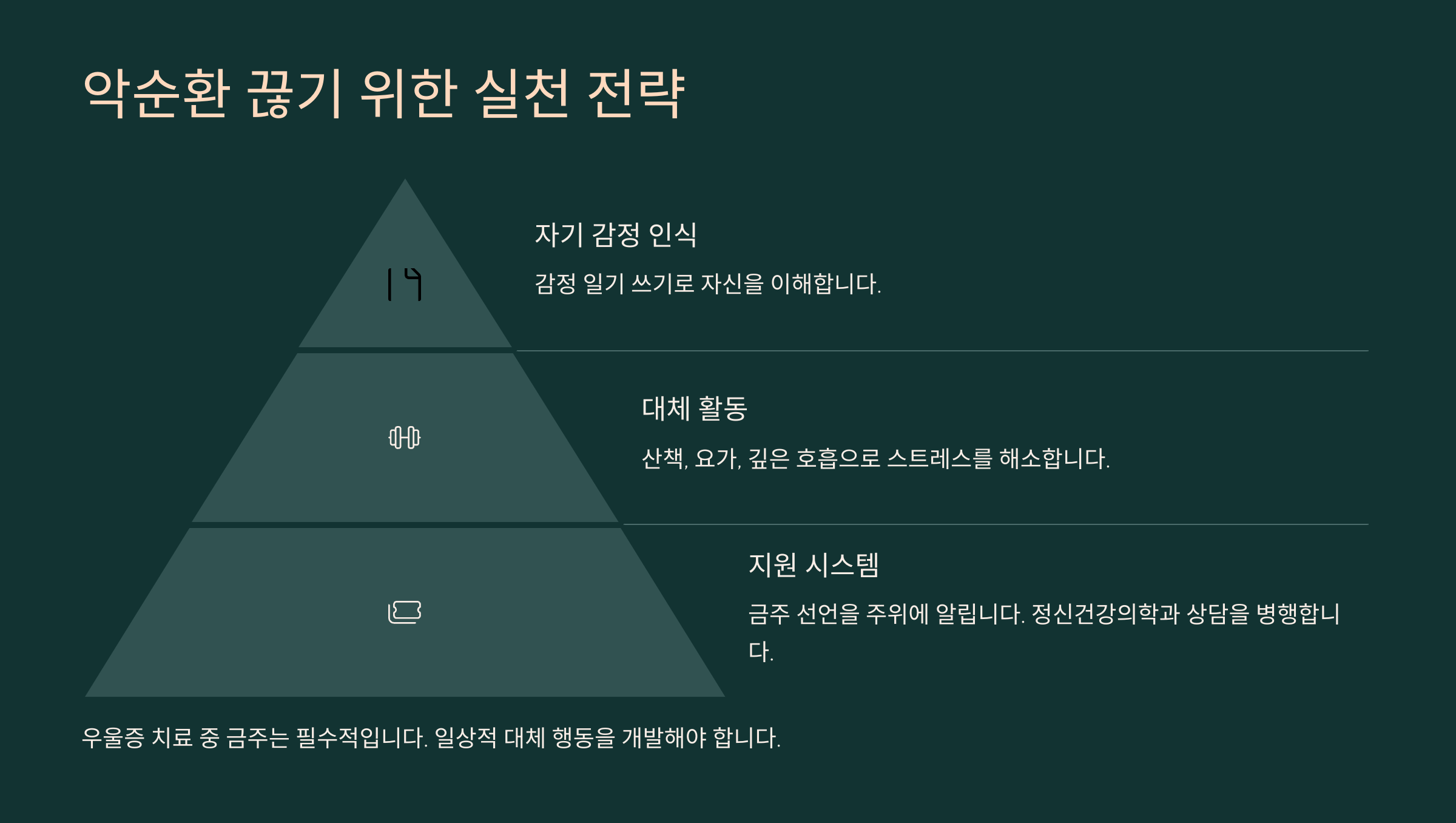 - 알코올은 일시적 위안이지만 장기적으로 우울증을 심화시킴