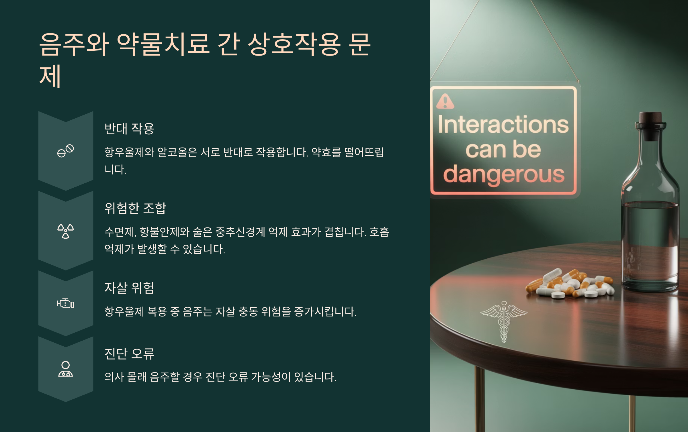 특히 우울증 환자의 경우, 음주가 약물치료의 효과를 떨어뜨리고 자살 충동을 높이는 주요 위험 요인이 될 수 있습니다.