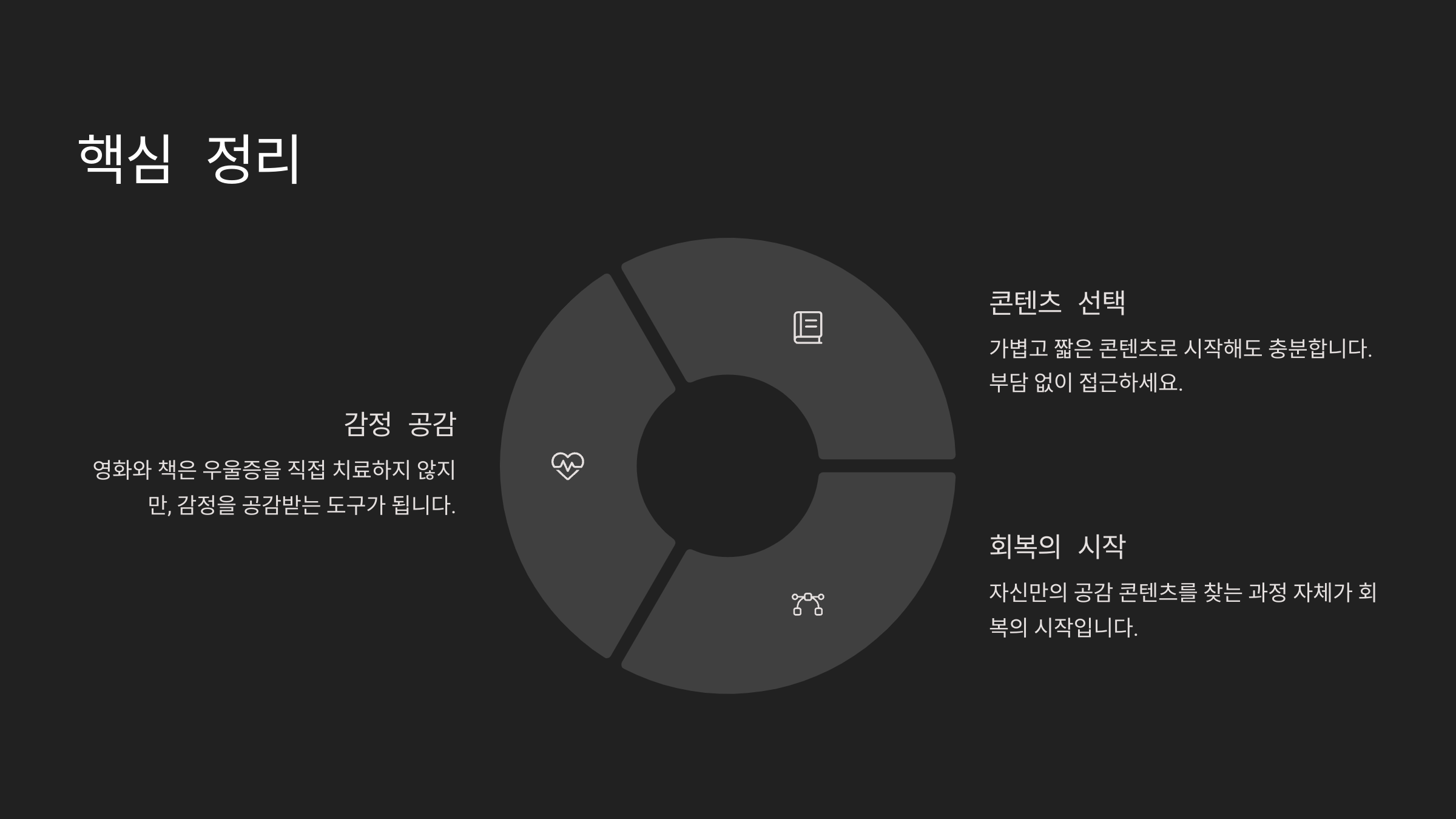 - 가볍고 짧은 콘텐츠로 시작해도 충분하며, 자신만의 공감 콘텐츠를 찾는 과정 자체가 회복의 시작입니다.