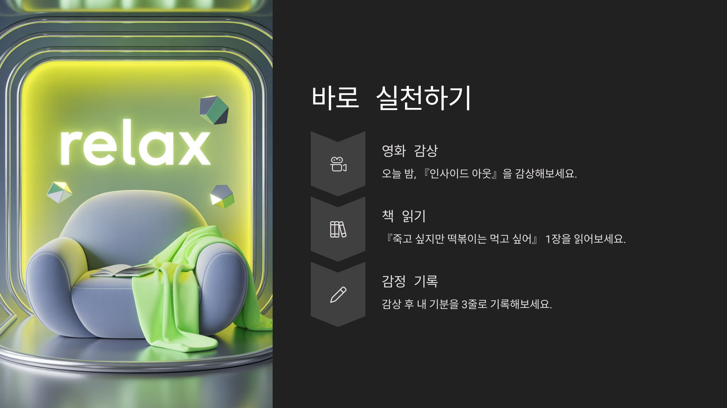 ➡️ 해결 방법: 영화나 책을 감정 상태에 따라 선택하고, 감상이 끝난 후 감정을 일기처럼 기록하는 습관을 추천합니다.