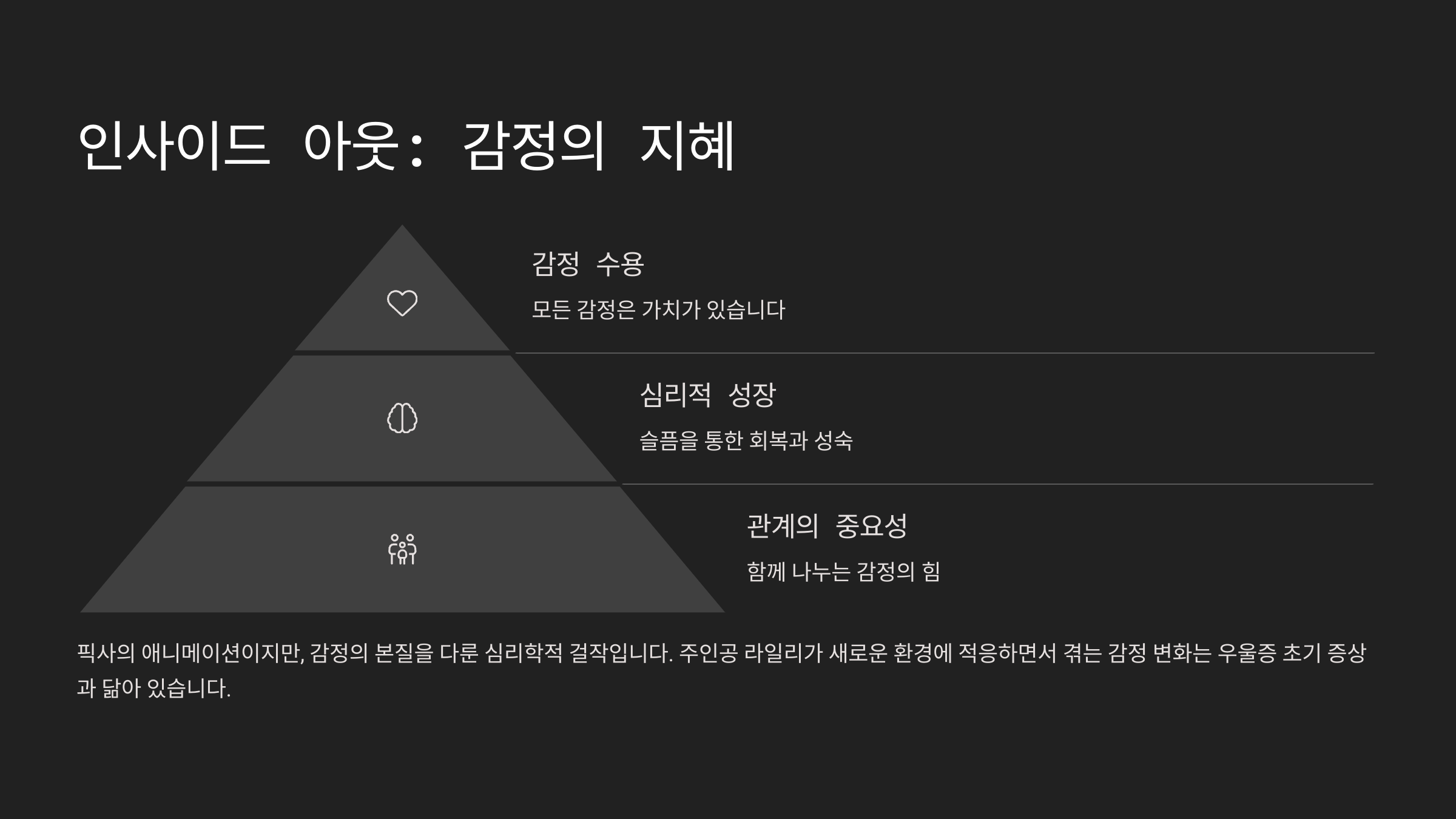 픽사의 애니메이션이지만, 감정의 본질을 다룬 심리학적 걸작입니다. 주인공 라일리가 새로운 환경에 적응하면서 겪는 슬픔, 불안, 혼란은 우울증 초기 증상과 닮아 있습니다.