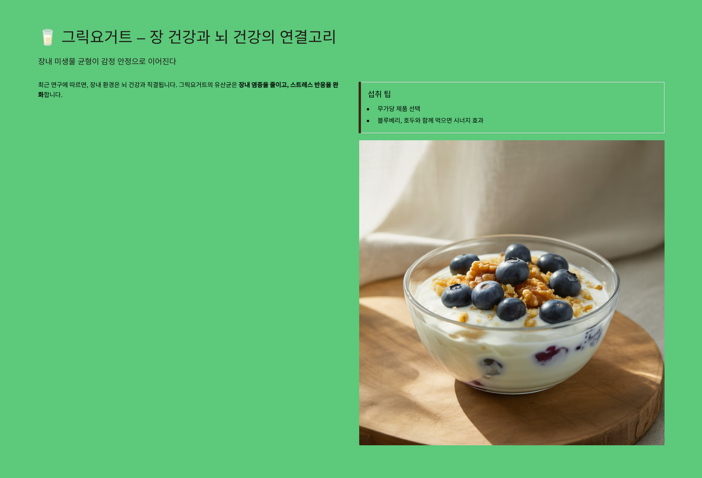 최근 연구에 따르면, 장 내 환경은 뇌 건강과 직결됩니다. 그릭요구르트의 유산균은 **장내 염증을 줄이고, 스트레스 반응을 완화**합니다.