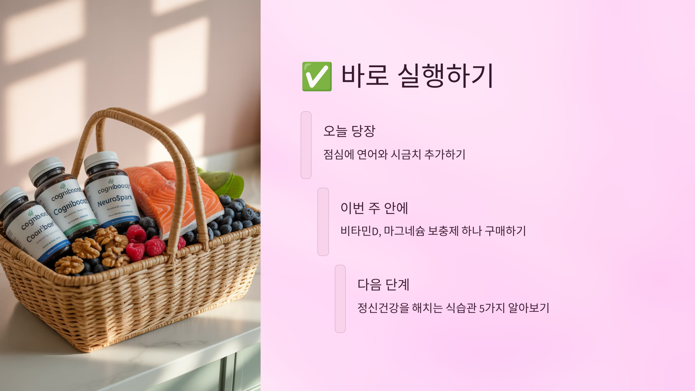 - 비타민D, 오메가 3, 마그네슘 등은 뇌 기능과 감정 조절에 직접적인 영향을 미칩니다.