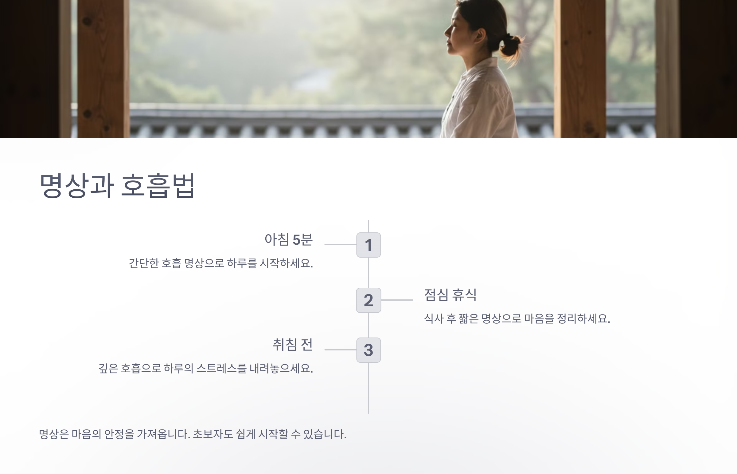 - 명상과 깊은 호흡은 마음을 안정시키는 데 도움을 줍니다. 하루에 몇 분이라도 조용한 곳에서 명상을 하거나 깊게 숨을 쉬는 습관을 들이면 스트레스가 줄어듭니다.