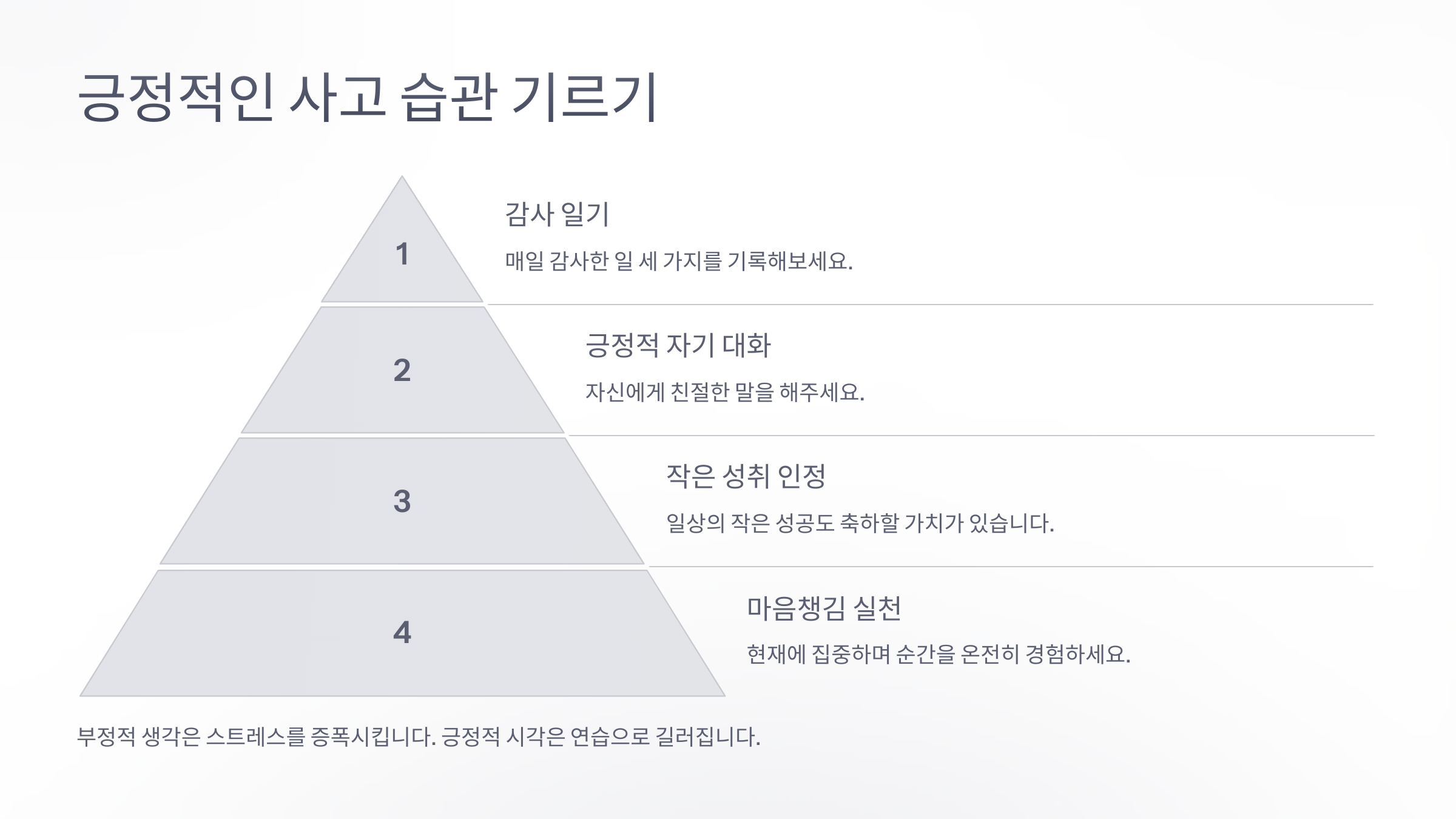 - 스트레스 상황에서도 긍정적인 시각을 유지하려는 노력이 필요합니다. 부정적인 생각을 줄이고, 감사하는 마음을 가지는 것이 정신 건강에 유익합니다.