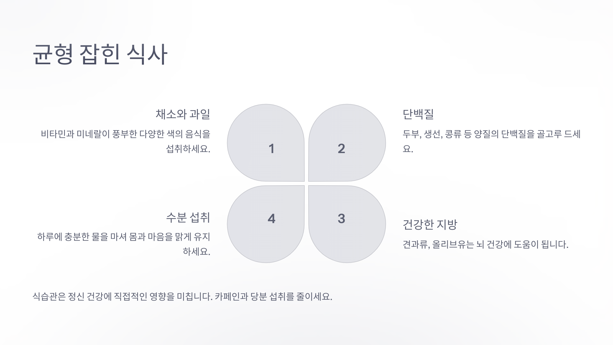 - 건강한 식습관은 정신 건강에도 영향을 미칩니다. 비타민과 미네랄이 풍부한 음식을 섭취하고, 카페인과 당분을 과도하게 섭취하지 않는 것이 좋습니다.