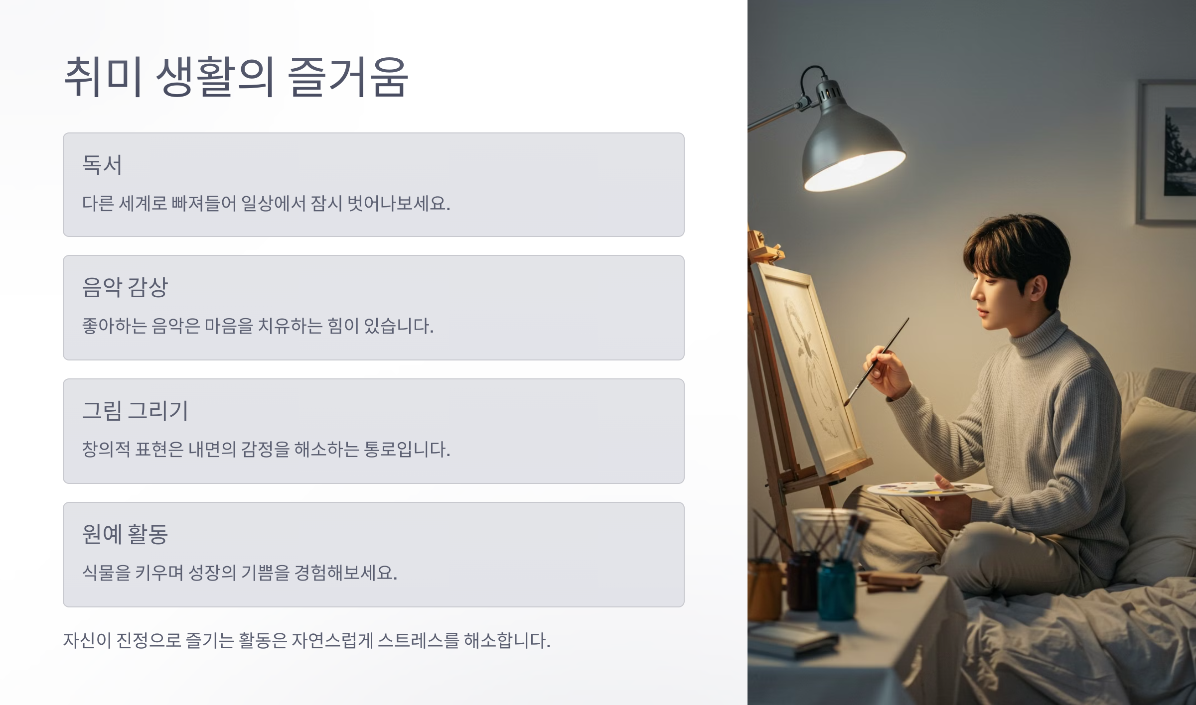 - 자신이 좋아하는 활동을 하면 스트레스가 자연스럽게 해소됩니다. 독서, 음악 감상, 그림 그리기 등 자신만의 취미를 찾아보세요.