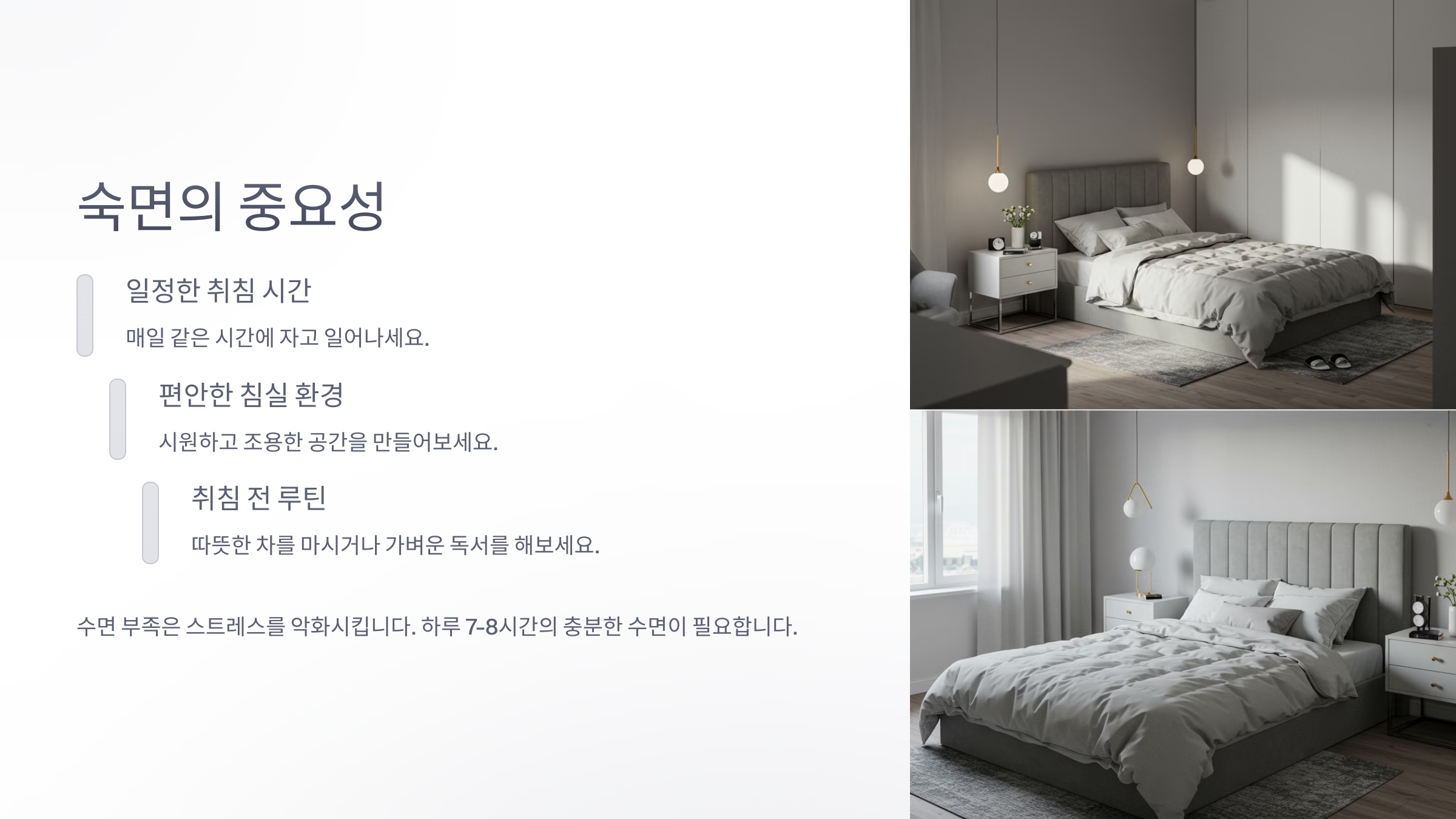 - 수면 부족은 스트레스를 악화시킬 수 있습니다. 매일 일정한 시간에 잠자리에 들고, 숙면을 취할 수 있도록 환경을 조성하는 것이 중요합니다.
