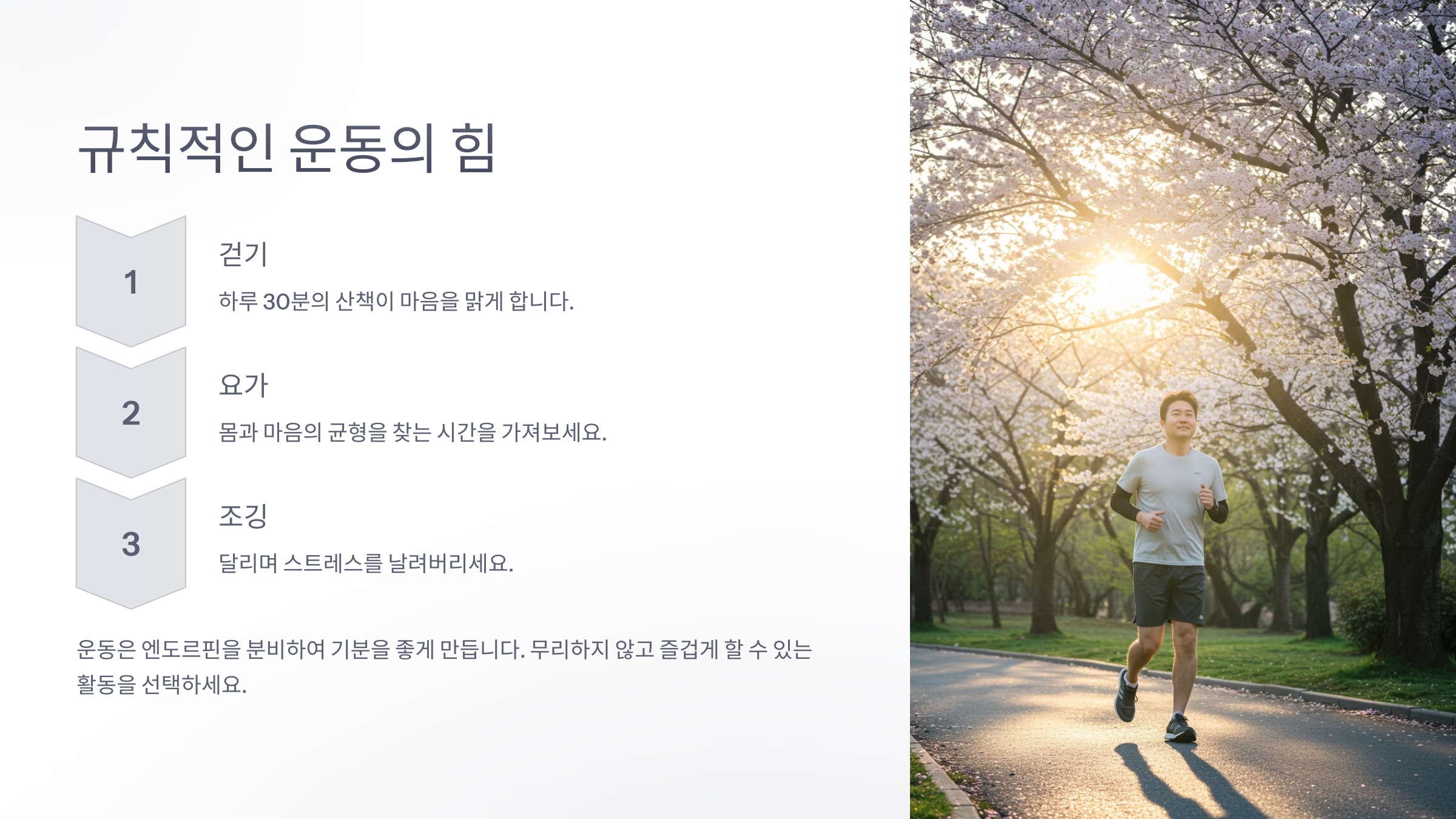 - 운동은 스트레스를 해소하는 데 큰 도움이 됩니다. 걷기, 요가, 조깅 등의 신체 활동은 엔도르핀을 분비하여 기분을 좋게 만듭니다.