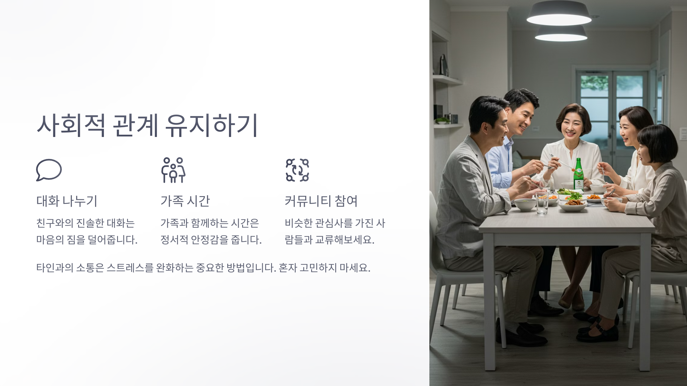 - 친구나 가족과의 대화를 통해 감정을 나누는 것도 중요합니다. 타인과의 소통은 정서적 안정감을 주며 스트레스를 완화하는 데 도움을 줍니다.