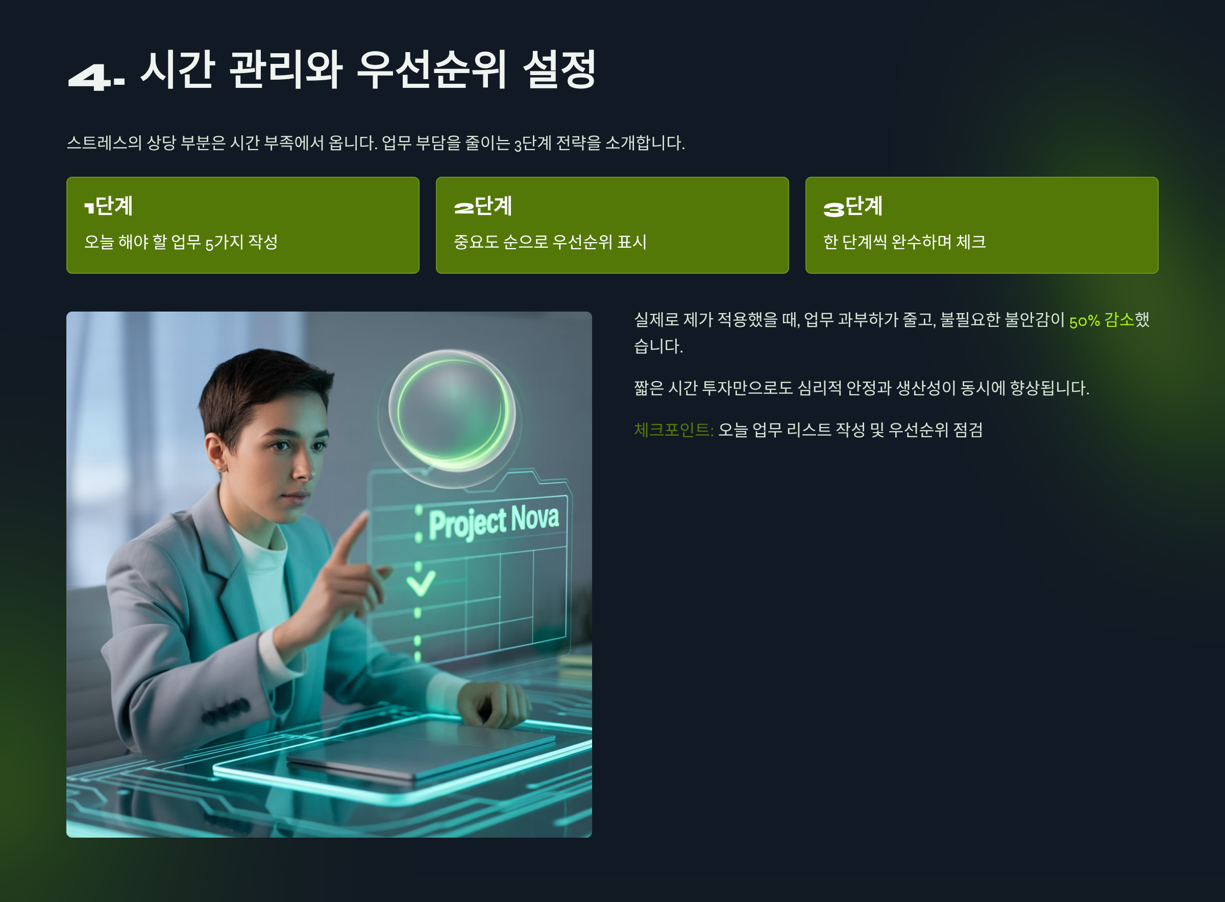 - 시간 관리와 우선순위 설정으로 불필요한 부담 감소