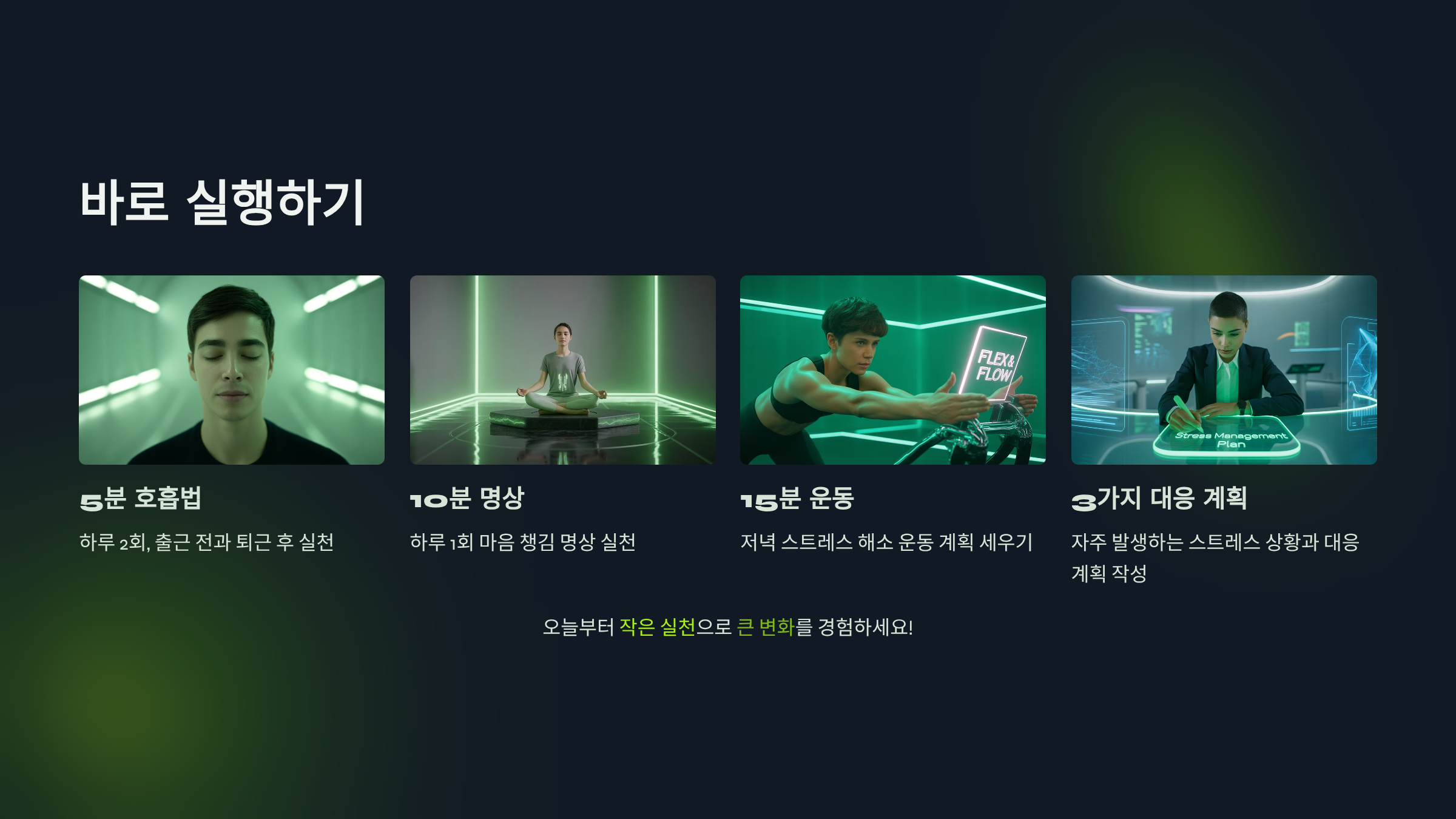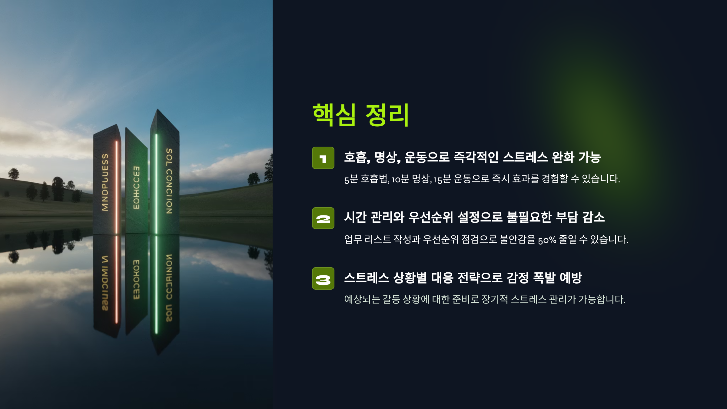 - 호흡, 명상, 운동으로 즉각적인 스트레스 완화 가능