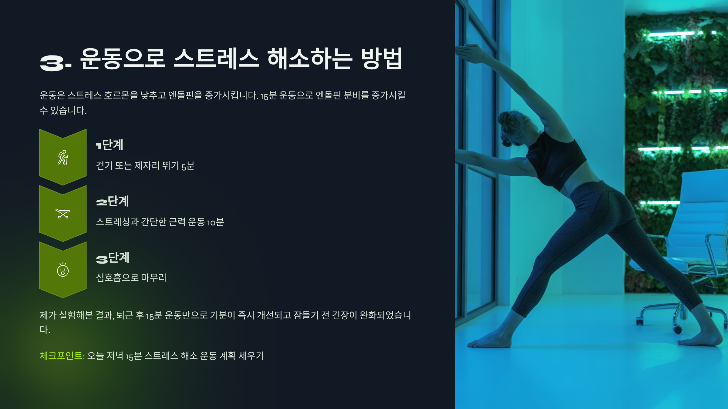 > 체크포인트: 오늘 저녁 15분 스트레스 해소 운동 계획 세우기