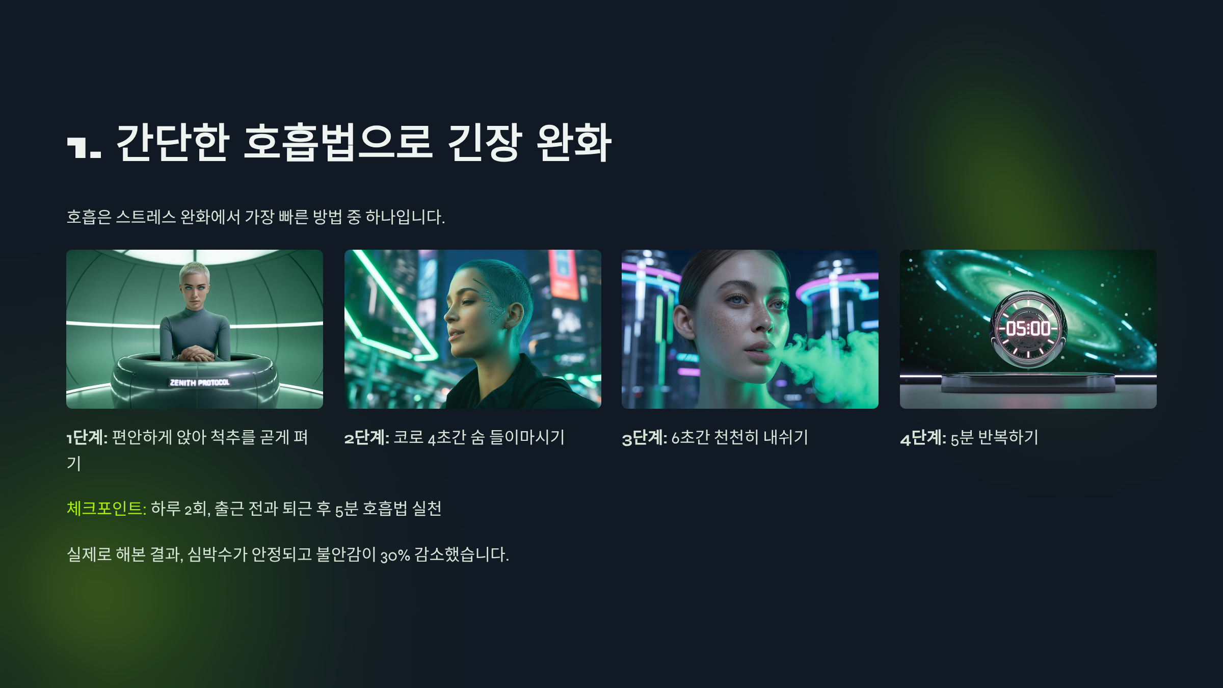 > 체크포인트: 하루 2회, 출근 전과 퇴근 후 5분 호흡법 실천