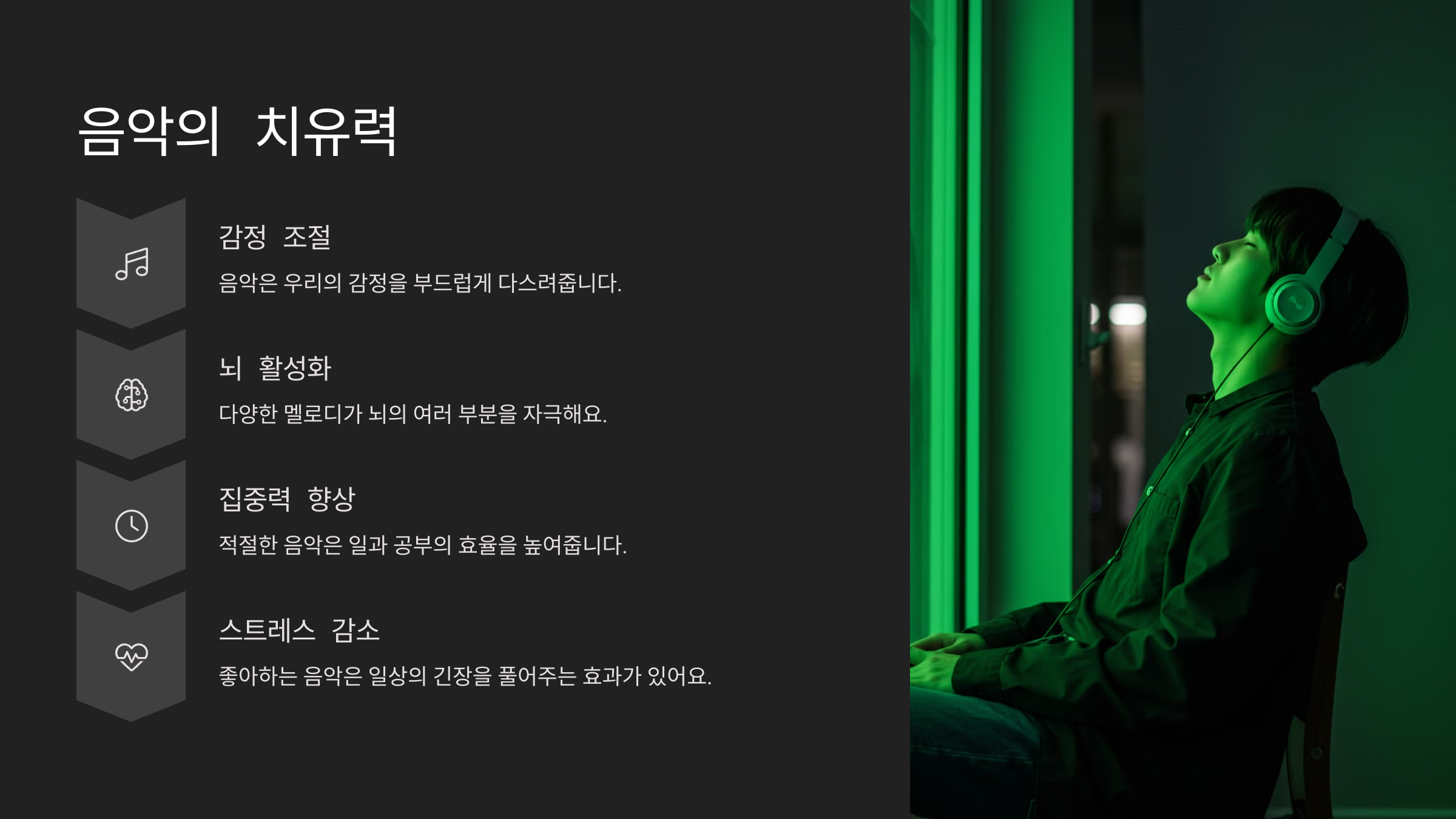 음악은 감정을 조절하는 강력한 힘을 가지고 있습니다. 하루 10분, 좋아하는 음악을 들으며 플레이리스트를 만들어보세요. 감정이 차분해지고, 집중력도 높아질 거예요.