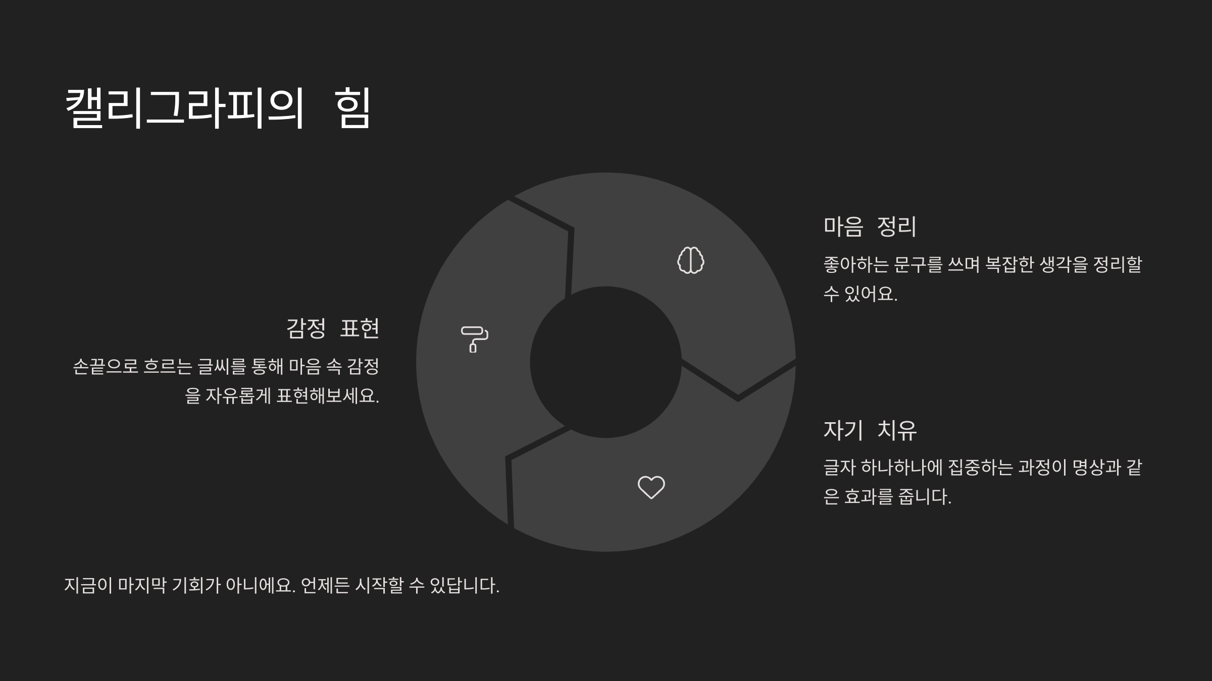 캘리그래피는 손글씨를 예쁘게 쓰는 예술이지만, 그 과정 자체가 큰 힐링이 됩니다. 손끝에서 흐르는 글씨를 통해 감정을 표현하고, 마음을 정리할 수 있어요.