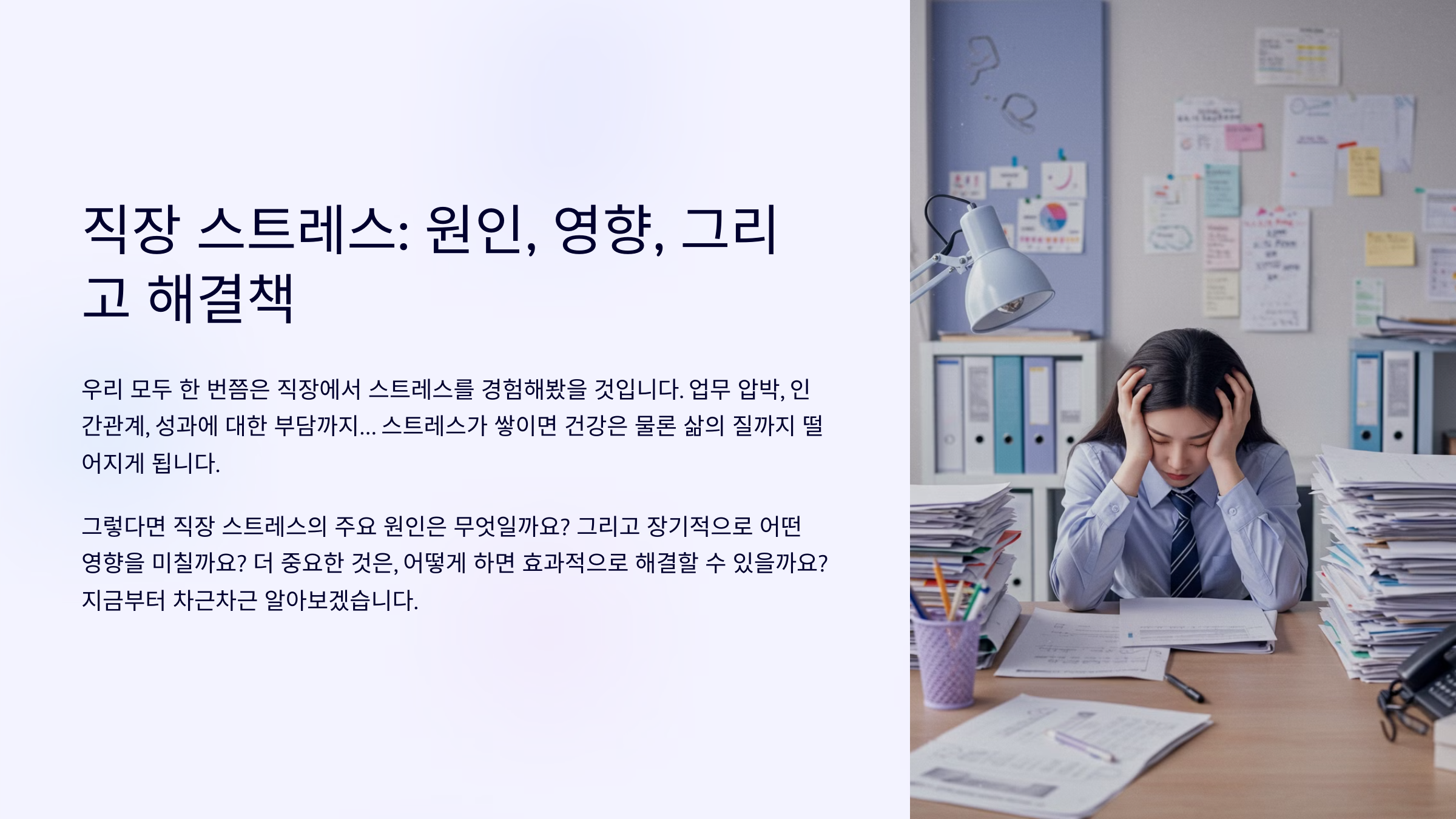 우리 모두 한 번쯤은 직장에서 스트레스를 경험해 봤을 것입니다. 업무 압박, 인간관계, 성과에 대한 부담까지… 스트레스가 쌓이면 건강은 물론 삶의 질까지 떨어지게 됩니다.