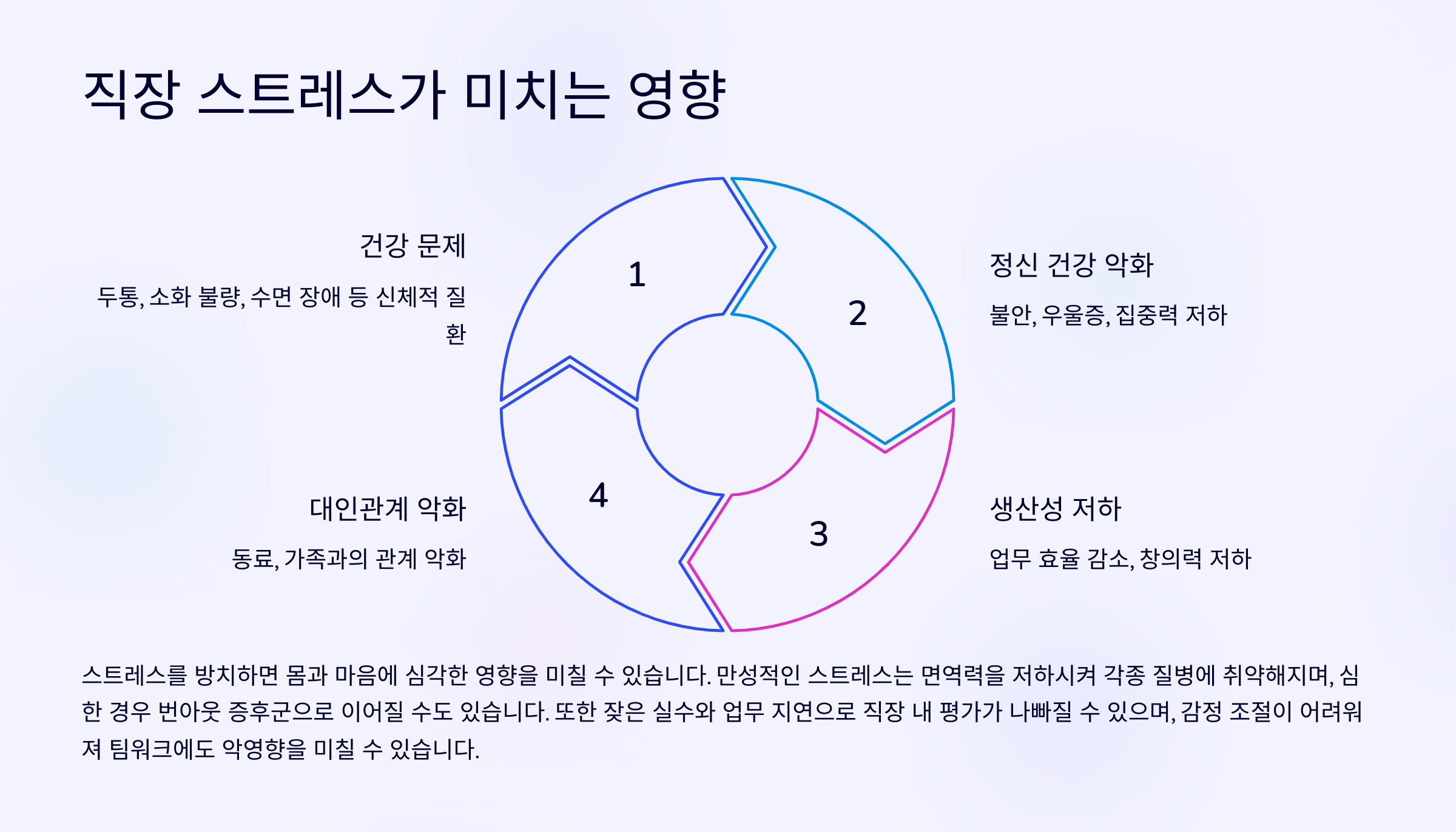그렇다면 직장 스트레스의 주요 원인은 무엇일까요? 그리고 장기적으로 어떤 영향을 미칠까요? 더 중요한 것은, 어떻게 하면 효과적으로 해결할 수 있을까요? 지금부터 차근차근 알아보겠습니다.