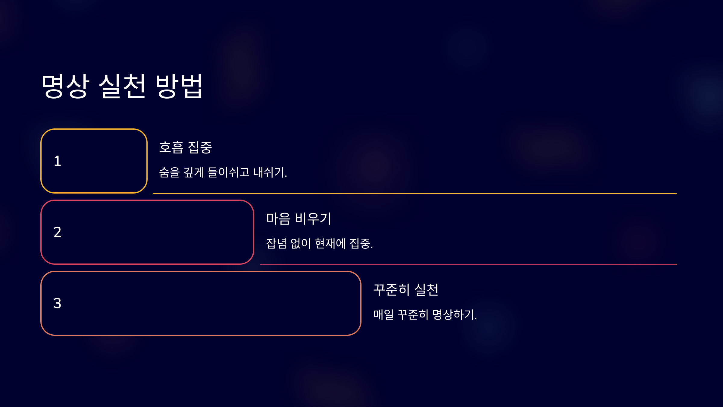 명상을 지속적으로 실천하다 보면, 정신적으로 더 건강해지고, 집중력이 향상되는 것을 느낄 수 있습니다. 일상에서의 변화가 생기고, 더 나아가 생산성도 높아지는 것을 경험하게 될 것입니다.