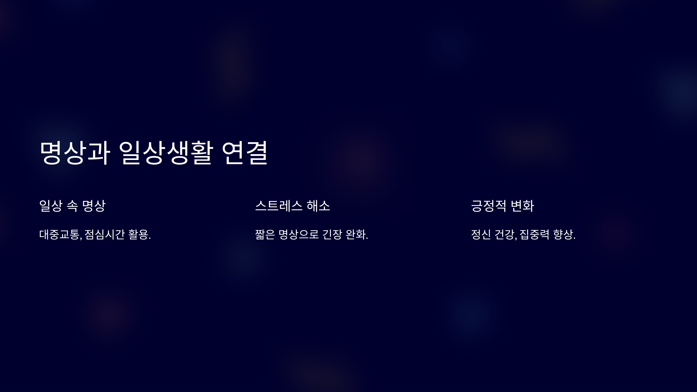 명상은 집중력과 생산성을 높이는 데 큰 역할을 합니다. 연구에 따르면, 규칙적으로 명상하는 사람들은 스트레스 수준이 낮고, 집중력이 향상된다고 합니다. 그래서 많은 직장인과 학생들이 명상을 통해 더 나은 성과를 내고 있습니다.