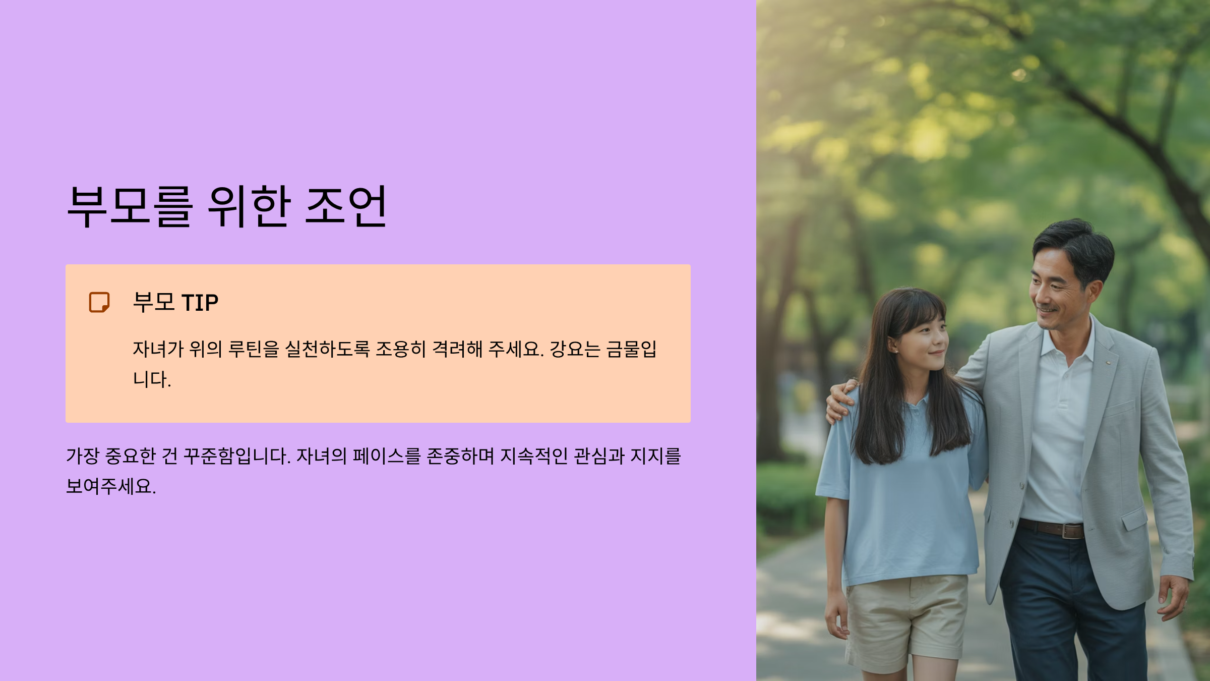 ✔️ 부모 TIP: 자녀가 위의 루틴을 실천하도록 조용히 격려해 주세요. 강요는 금물입니다.
