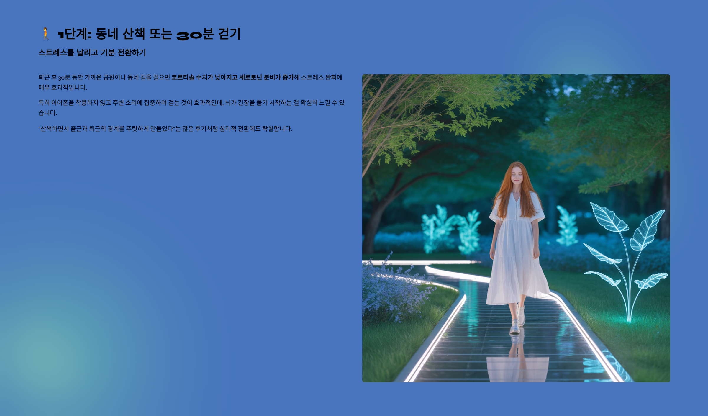 퇴근 후 30분 동안 가까운 공원이나 동네 길을 걸으면 코르티솔 수치가 낮아지고 세로토닌 분비가 증가해 스트레스 완화에 매우 효과적입니다. 특히 제가 했던 방법은 이어폰을 착용하지 않고 주변 소리에 집중하며 걷는 것인데, 뇌가 긴장을 풀기 시작하는 걸 확실히 느낄 수 있었습니다. “산책하면서 출근과 퇴근의 경계를 뚜렷하게 만들었다”는 많은 후기처럼 심리적 전환에도 탁월합니다.